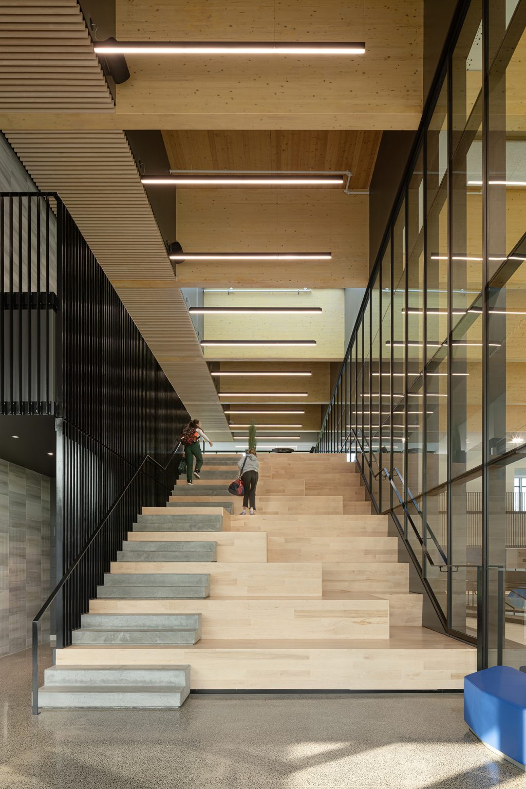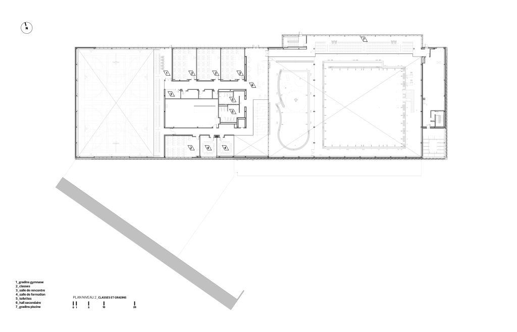 Au cœur du complexe, un escalier gradin en bois offrant une vue directe sur les bassins devient un lieu de rencontre et de socialisation. Au deuxième niveau se trouvent une salle multifonctionnelle, quatre classes, des gradins ainsi que le foyer supérieur. En continuité avec le hall d’accueil et profitant de la vue vers les bassins, ce foyer propose un autre espace de détente, de rencontre et d’étude, ainsi qu’un accès aux gradins de 250 places dans la section des bassins et aux gradins comportant 100 places dans la section du gymnase.