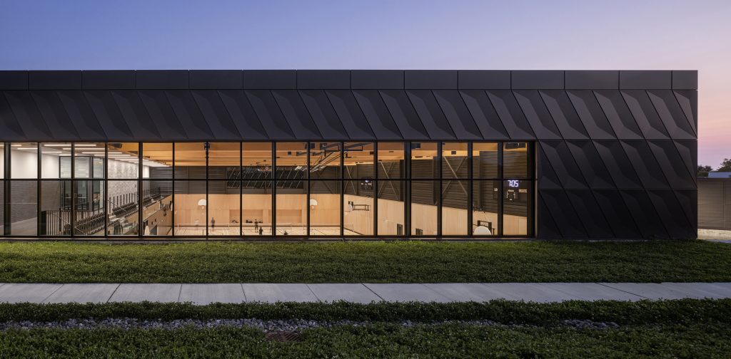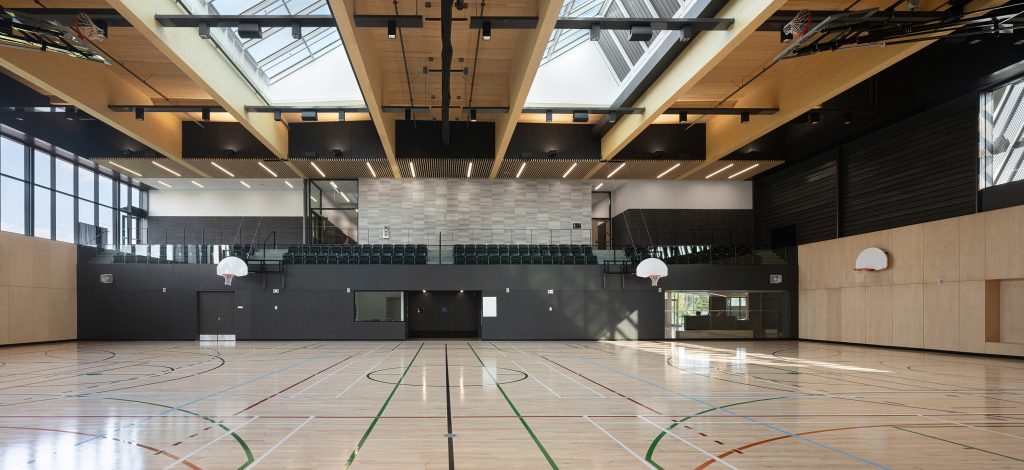 Partout dans le complexe, les immenses baies vitrées et les puits de lumière maximisent l’apport de lumière naturelle. Dans le gymnase, les puits de lumière atteignant près de 20 mètres de longueur contribuent à laisser pénétrer une lumière zénithale. Afin contrôler la luminosité, la fenestration est dégagée et libre sur la façade nord, tandis qu’elle se trouve filtrée par une deuxième peau en aluminium perforé sur la façade sud.