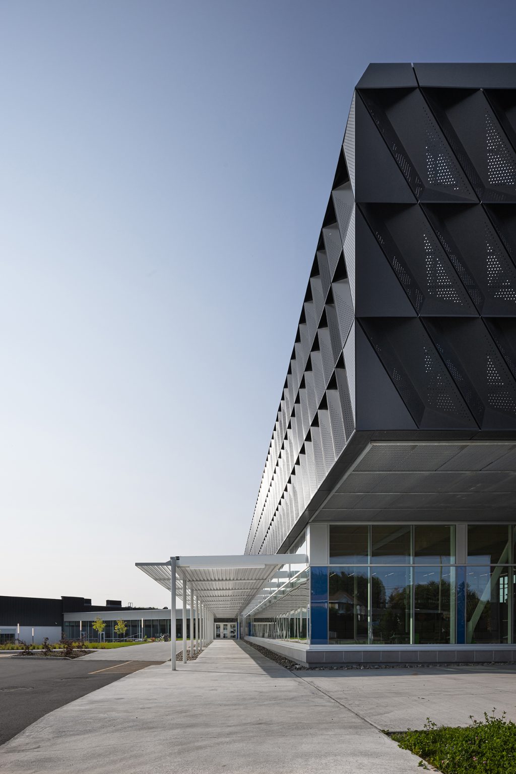 Dans son traitement architectural, l’agrandissement reprend et réinterprète les codes du patrimoine moderne de l’école secondaire datant de 1974. S’inspirant du bâtiment existant, composé d’un basilaire dont les murs et les contreforts en béton sont coiffés de tôle métallique, le nouveau volume s’intègre en revisitant la stratification des niveaux. Ainsi, un basilaire complètement vitré reprend l’alignement des sections de béton, tandis qu’un parement d’aluminium perforé à effet de diamant évoque l’angulation des contreforts en hauteur.