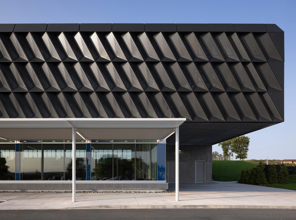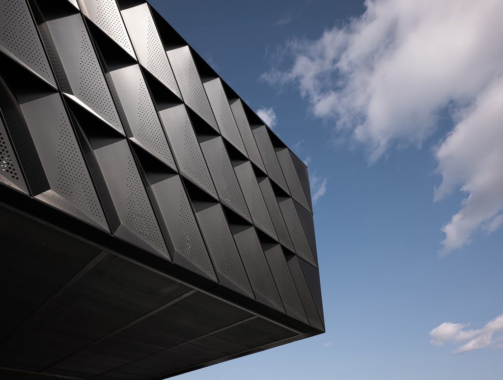 D’entrée de jeu, le bâtiment impressionne par sa coque métallique qui frappe l’imaginaire. Le « mouvement » provoqué par les angles brise élégamment la monotonie qu’aurait pu avoir de telles façades longitudinales.