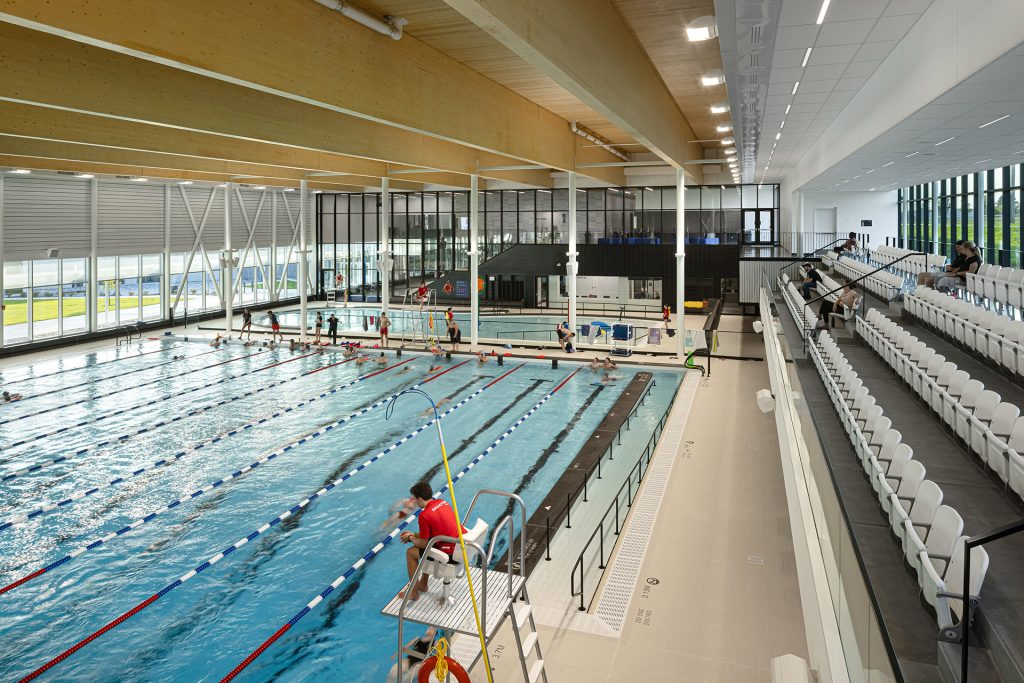 La structure de bois massif de la toiture constitue un élément innovant et distinctif du complexe. Les impressionnantes poutres du secteur piscine, d’une longueur de 56 mètres, espacées aux 5 mètres, sont chapeautées de panneaux de CLT (Cross-Laminated Timber). D’une portée libre de 28 mètres dans le gymnase et de 34 mètres au-dessus du bassin sportif, elles sont mises en valeur par la lumière naturelle. Outre sa qualité architecturale, cette structure de bois participe à l’effort environnemental en séquestrant plus de 670 tonnes de CO2.