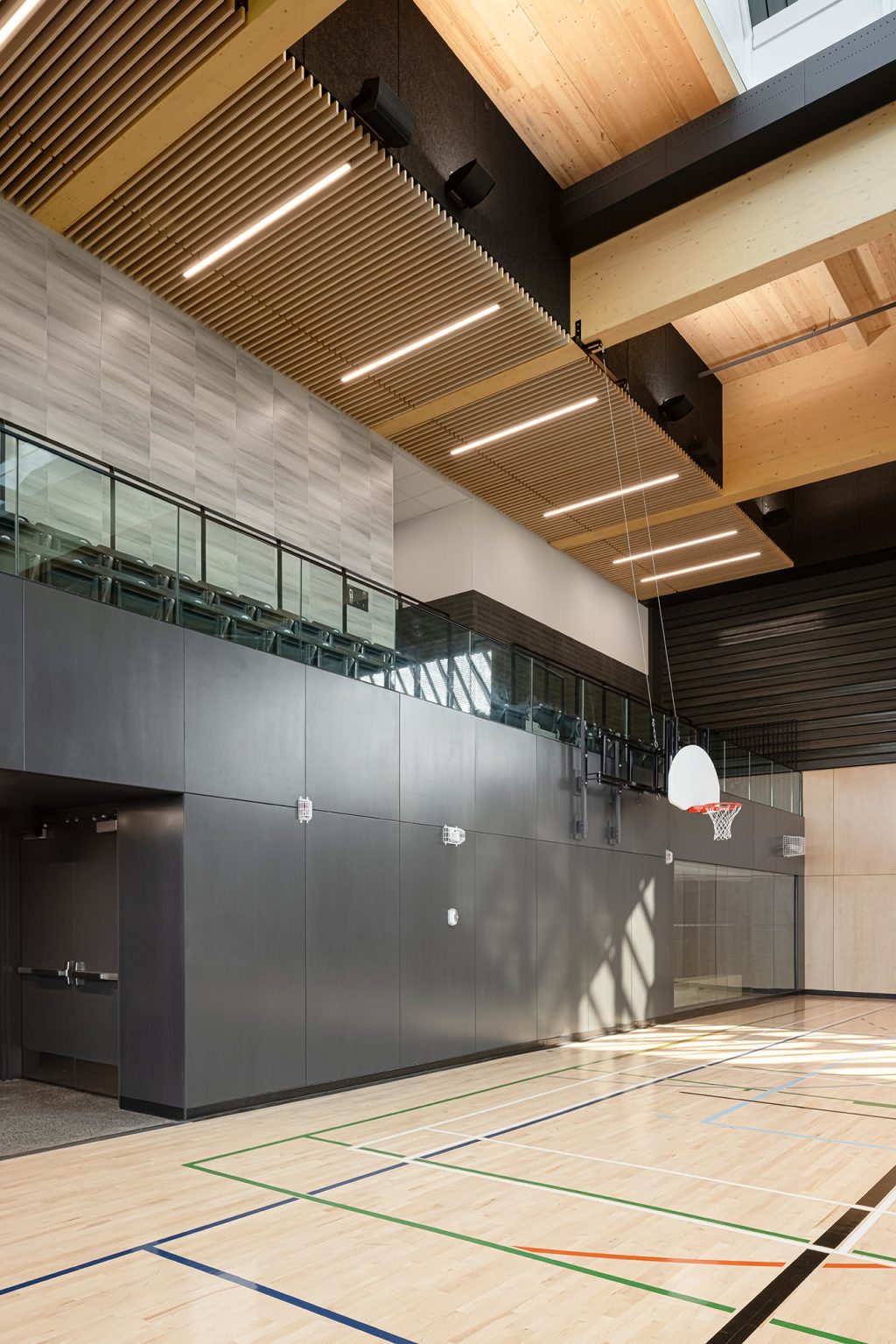 Une attention particulière a été portée à l’ambiance acoustique de ces grands espaces vitrés afin de maintenir les temps de réverbération sous 1,5 seconde. À la fois finition intérieure et support de l’enveloppe, un tablier acoustique perforé et rempli de laine isolante minimisant l’écho a été installé sur les murs de la piscine et du gymnase. Des panneaux acoustiques de tissu recouvrent les surfaces dures dans les parties hautes du gymnase tandis que des tuiles de fibre de bois cimentaire sont utilisées dans le secteur piscine. Dans les espaces communs, le confort acoustique repose sur un plafond suspendu de tuile acoustique de haute performance derrière la structure de lattes de bois, tandis qu’en toiture, la structure de bois offre une qualité d’absorption du son supérieure à celle de bien des matériaux.