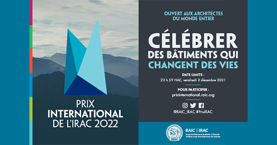 « OTTAWA, le 4 août 2021 – L’Institut royal d’architecture du Canada (IRAC) accepte maintenant avec plaisir les candidatures pour le Prix international de l’IRAC 2022. Le Prix, décerné tous les deux ans, célèbre l’architecture jugée comme étant transformatrice dans son contexte sociétal et emblématique des valeurs humaines de respect et d’inclusion.