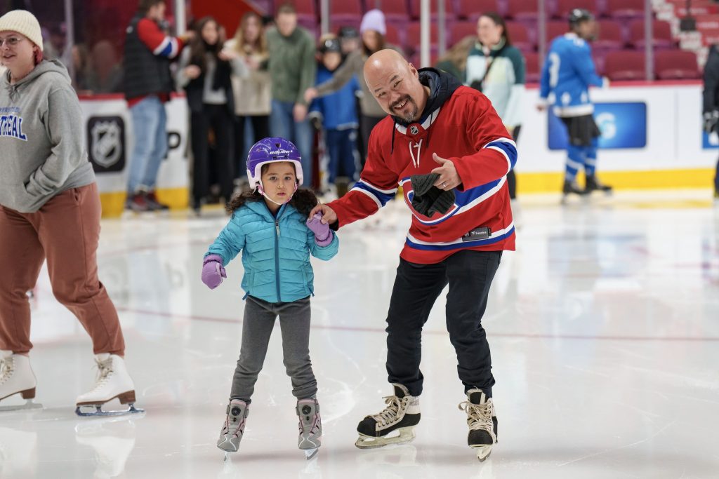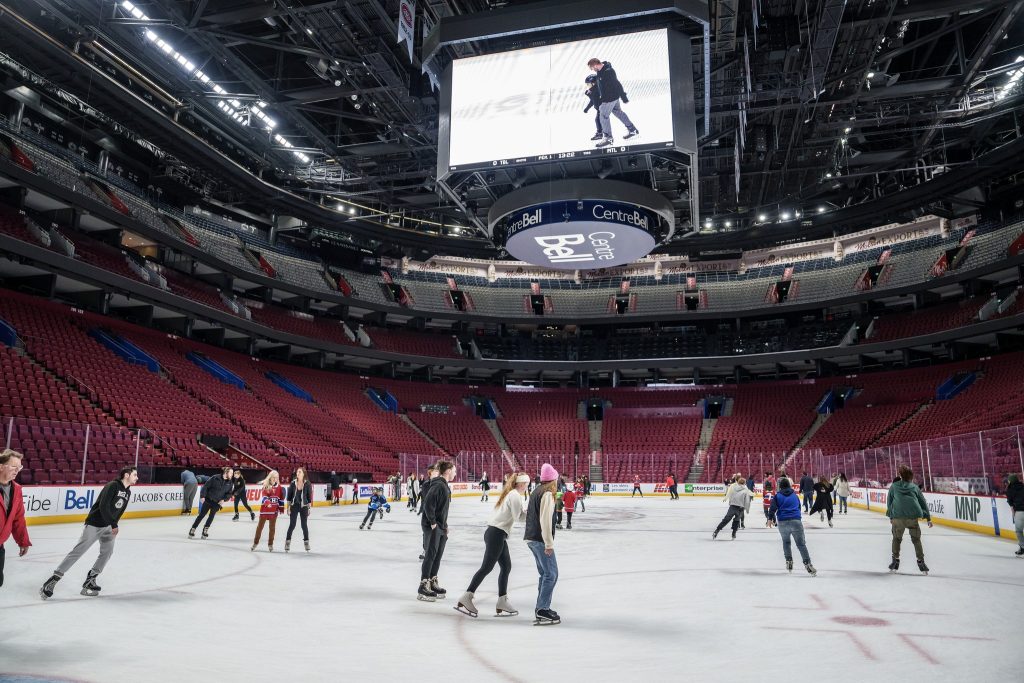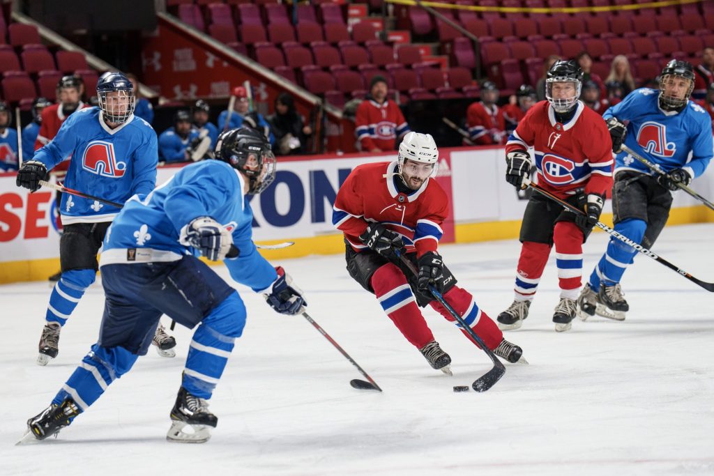 Légende : Dévoilement officiel du montant remis aux trois écoles d’architecture du Québec et leurs associations étudiantes respectives en présence des représentants de Défi Sport Architecture, des commanditaires principaux, des écoles d’architecture, des associations étudiantes et des collaborateurs. L’ancien joueur du Canadien de Montréal Francis Bouillon effectue la mise au jeu en compagnie du capitaine de l’équipe d’architectes de Québec Philippe Lafrance-Boucher (Lemay Québec) et de la capitaine de l’équipe d’architectes de Montréal, Madeline Leroux (NFOE). Crédit photo : Centre Bell.