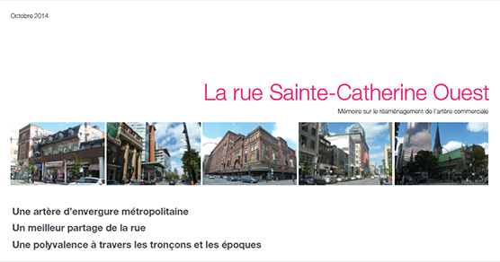 « À la lumière des différentes caractéristiques de Sainte-Catherine Ouest et de l’importance de cette artère commerciale autant à l’échelle locale que régionale, nous en venons à rejeter d’emblée les quatre scénarios proposés par la Ville de Montréal pour le réaménagement de la rue. Le manque d’audace et de vision à long terme des scénarios est inacceptable considérant le caractère emblématique de Sainte-Catherine. Les sections suivantes présentent différents principes directeurs ainsi qu’un nouveau scénario pour le réaménagement de l’artère.