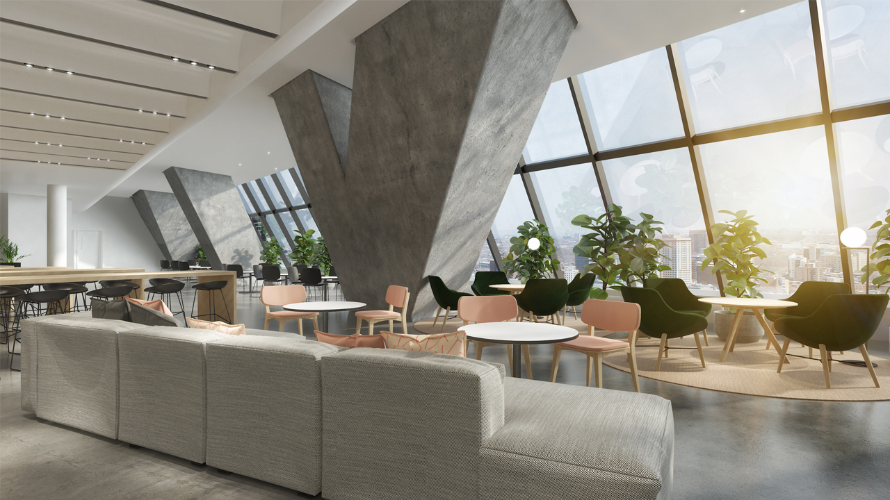 Les immenses structures de béton obliques, qui proviennent de l’architecture originale de la tour, impressionnent par leur taille et apporteront un caractère unique à l’espace. Bon réflexe de les avoir laissées exposées.