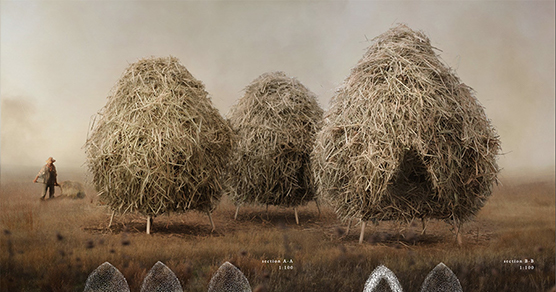 On les aperçoit de loin – créatures inconnues et familières qui s’érigent dans le champ – semblant attendre. Elles captent la lumière du soleil et émettent une chaude lueur dorée. Le vent les fait bouger légèrement. Elles forment une constellation triangulaire, regroupées, sans jamais être trop près les unes des autres. Elles sont de la même espèce, mais chacune a sa propre forme, sa propre expression. Un élément de la nature s’est transformé en entité vivante. En s’approchant, on constate que cette entité est composée de millions d’objets distincts : des brins de foin. Tout près, on peut sentir son odeur franche et toucher la chair à la fois piquante et douce de sa structure. Puis on y entre. La pandémie de la Covid-19 nous a beaucoup appris. Elle a mis en évidence notre éloignement face à la nature et à l’agriculture ainsi que l’importance de la biodiversité. À l’échelle mondiale, un regain pour les méthodes traditionnelles et durables d’habiter notre terre émerge. Hässja est une installation basée sur l’un de ces arts presque perdus de travailler le sol : les structures de séchage du foin. Ces trois structures, faites à partir des plantes mêmes qui les entourent, ne sont pas uniquement éducatives; elles sont formées et disposées pour mettre en valeur les qualités inhérentes dont elles sont les héritières. Contrairement aux structures de séchage du foin habituelles, celles-ci sont dotées d’une chambre intérieure. Ce petit espace constitue un refuge contre le monde d’aujourd’hui, en plus de proposer une réflexion sur la relation de l’homme avec la nature et sur ses façons, passées et futures, d’habiter la terre.