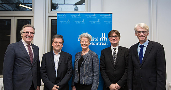 DE GAUCHE À DROITE | Raymond Lalande, vice-recteur aux relations avec les diplômés, partenariats et philanthropie; Alain Lefrançois, PDG, Epsylon Concept; Anik Shooner, co-fondatrice de Menkès Shooner Dagenais LeTourneux Architectes; Paul Lewis, doyen de la Faculté de l’aménagement; Jacques Lachapelle, directeur de l’École d’architecture