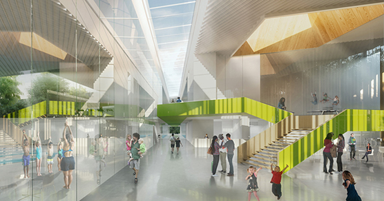 Le projet de $61M fut organisé par la municipalité de Laval, et reçut 17 dossiers lors de la présélection avant de sélectionner quatre finalistes pour l’étape de conception. Les équipes retenues étaient alors: ACDF* Architecture; Consortium Saucier + Perotte Architectes/ Neuf Architectes; Lapointe Magne et associés et l’équipe lauréate Consortium NFOE / HCMA. Bien que la formule soit encore éloignée du concours anonyme, international, ouvert à tous, ce concours dynamique et son aboutissement sont un premier pas vers le renfort de l’identité architecturale lavalloise. L’important programme comportera trois bassins et des gradins pouvant accueillir jusqu’à 1200 spectateurs, le tout devant se qualifier pour la certification LEED Or. On peut certainement féliciter la volonté de transparence dont la ville a fait preuve grâce à une audition publique des présentations des finalistes – audition qui accueillit quelques centaines de citoyens et de professionnels des sports aquatiques, de l’architecture et de l’urbanisme, et dont nous livrons les enregistrements vidéo.