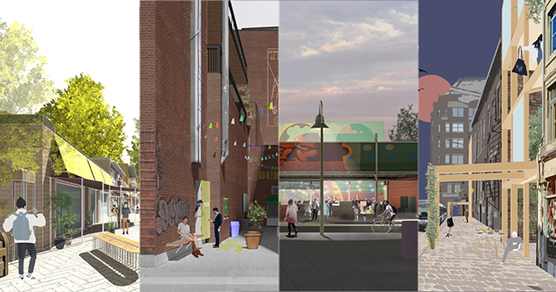 « Lancé le 15 juin 2020, ce concours d’idées, adressé aux étudiant·es des quatre facultés de design et d’architecture du Québec, appelait des approches innovantes, sur fond de crises humanitaires, climatiques et sanitaires. L’élaboration des projets étudiants coïncidait avec d’importants bouleversements sociaux, de l’importante dégradation de la santé publique causée par les premières vagues de la COVID-19 à la mise à la lumière derechef de crimes et d’injustices commises envers des minorités visibles ici et ailleurs. Toutes les sphères du design s’impliquent désormais quant à la mise en œuvre de diverses solutions pouvant adresser ces problèmes : afin que notre société puisse évoluer face aux crises citées ci-haut, la pratique de l’architecte et le cadre législatif entourant la profession doivent changer. À cet effet, la réflexion novatrice qu’incite Repenser la rue commerciale peut-elle incarner un vecteur d’évolution de la profession d’architecte? Peut-on y entrevoir, parmi les solutions qui y furent proposées, certaines fenêtres sur la ville qui accueillera la société de demain ?