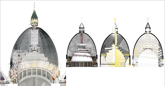 Notons d’emblée que le volet spirituel, de façon contradictoire, a été contourné ou mal compris par les équipes concurrentes. C’est en tout cas ce qui ressort du rapport du jury présidé par le professeur Carlo Carbone de l’UQAM : rapport dont la rédaction, la précision et la transparence sont, à toutes fins pratiques, exemplaires. Si les volets fonctionnel, muséal et intégration de l’ingénierie se sont vus attribués chacun 25% de la note, le volet spirituel se trouvait limité à 15%, guère plus que les 10% attribués au « potentiel d’animation et d’interprétation du concept d’aménagement de l’entre-dôme ». Comment expliquer ce glissement dans la compréhension d’un mandat architectural dont l’objectif se résume, de façon éminemment transcendantale, à une ascension intérieure? Il faut sans doute y voir la marque d’une double nature métaphysique et financière du projet, tant on imagine mal que cette expérience de l’entre-dôme sera aussi gratuite que peut l’être la montée des marches à genoux. « Le jury constate que les 4 prestations ont peu développé le critère spirituel souhaité », jury qui regrette de surcroit que le traitement du « drapé » dans le projet lauréat « ne se traduise pas aussi clairement sur le plan spirituel », tandis qu’il reproche paradoxalement au projet de Provencher Roy un concept qui « repose sur un contrôle de la lumière hors mandat ». On aurait pourtant cru que le travail de la lumière pouvait accompagner spirituellement le pèlerin dans une ascension. »