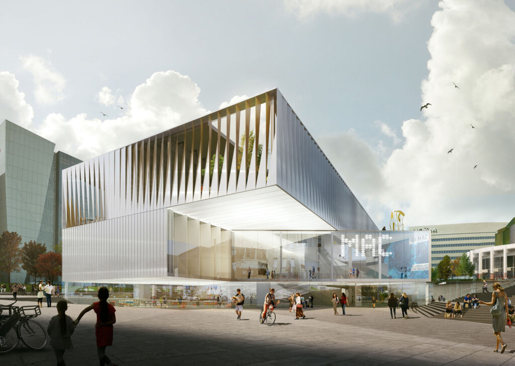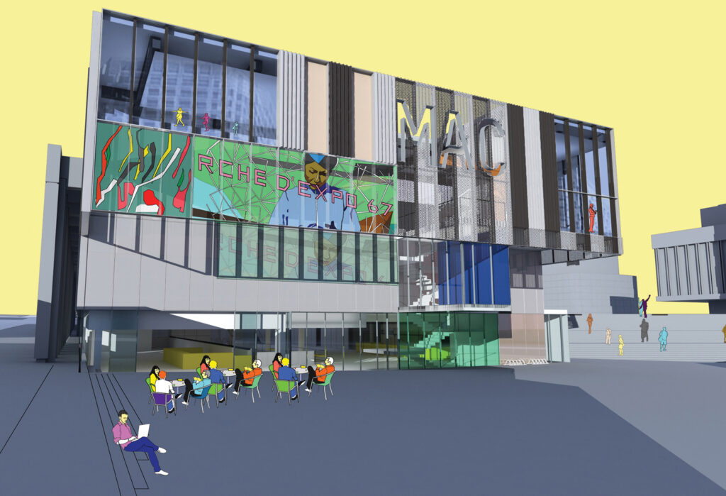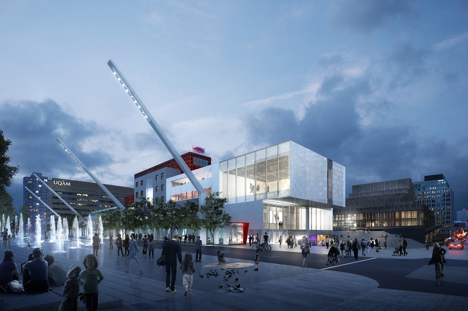 Nouveau concours, procédure bien différente. Suite à l’appel de candidatures en juin 2017, seuls 11 bureaux ont osé soumettre un dossier, dont 2 seront jugés non conformes. Il était encore envisageable d’inviter les 9 équipes, mais la procédure restrictive – et toujours opaque – de la « présélection » a réduit l’événement à 4 équipes familières de l’exercice : Atelier Big City + FSA architecture, Consortium DHA + NFOE architectes, Consortium Saucier + Perrotte et GLCRM architectes, Provencher Roy + Associés architectes. Un jury de 7 personnes, dont 4 architectes, intégrait à la fois le président du Conseil d’administration du MACM (le très présent Alexandre Taillefer) et son directeur général (le respecté John Zeppetelli). Président du jury en 2017, l’architecte Mario Saia, connaît bien le site pour avoir produit le pavillon des sciences de l’UQAM, qui fait écran au nord de la Place des Arts, mais également pour avoir été un des 100 concurrents malheureux en 1983 : comme le furent les regrettés Dan Hanganu, Victor Prus, Roger d’Astous et bien d’autres. Autant dire que toute une génération eut maille à partir avec ce qui devint, malheureusement, l’éléphant blanc de l’art contemporain au Québec. Au vu de l’extraordinaire densification du Quartier des Spectacles, il était urgent non seulement d’agrandir le musée, mais plus encore de lui donner un souffle nouveau, une véritable présence. »