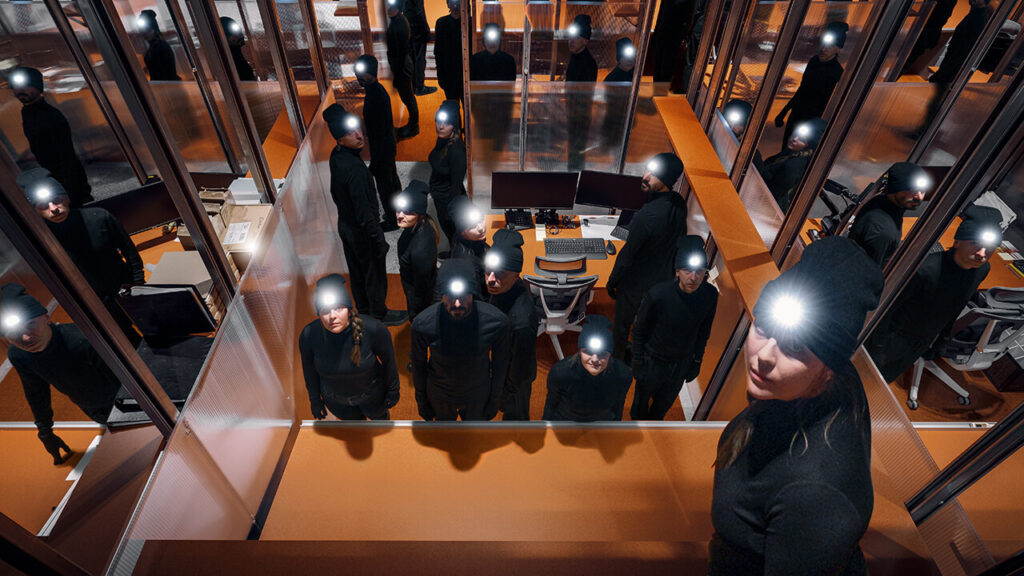 Pour certains, ce décor pourrait paraître austère, voire inhospitalier. À nos yeux, il devient plutôt le théâtre d’une danse humanisée par les mouvements journaliers des travailleurs. L’ajout d’une signature colorée, orange brûlé, vient d’autant plus renforcer ce côté théâtral.