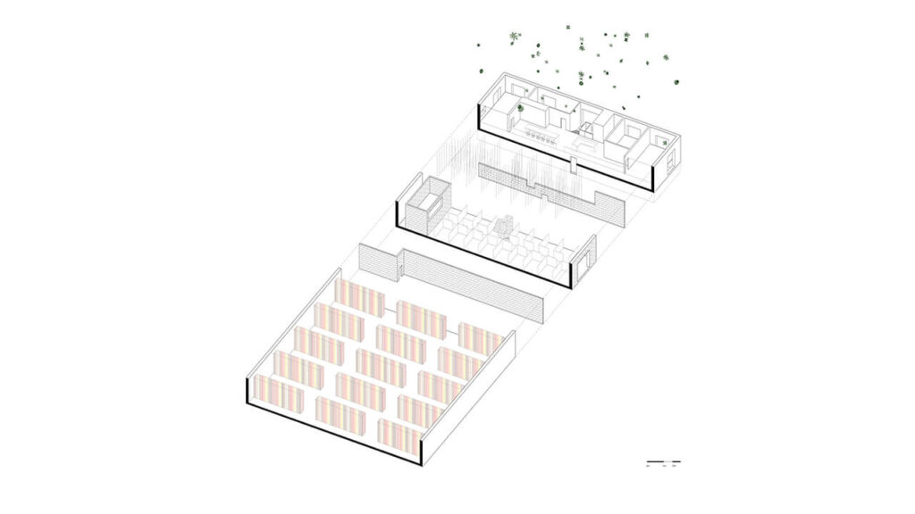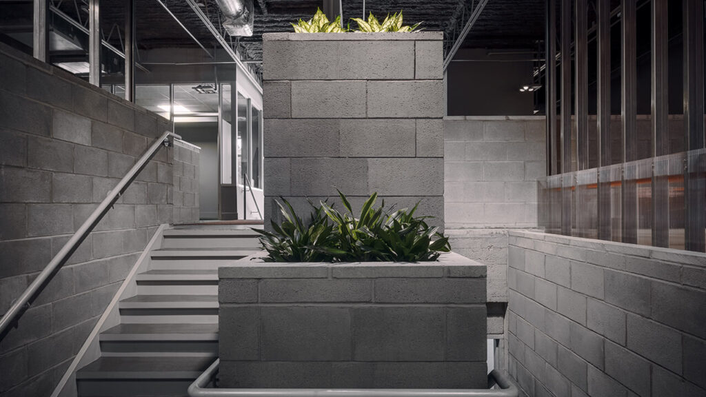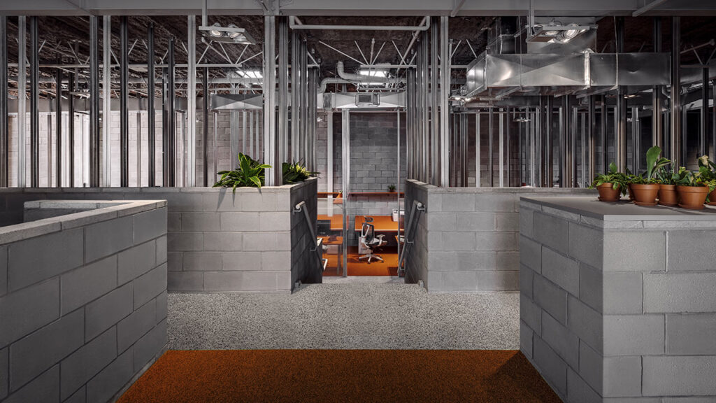 Valorisant un aménagement où les collaborateurs peuvent facilement communiquer entre eux, l’intervention jumelle des zones privées assurant la nécessité de distanciation physique pour la protection et le bien-être de chacun, des espaces de rencontre, comme des secteurs de repos, de sport et de divertissement. La portion dédiée aux bureaux, un espace distribué en demi-niveaux, s’avérant trop exiguë pour les besoins de l’entreprise nécessite une complète re-configuration (accueil, bureaux administratifs, salle de conférence, cuisine, salle des employés et rangement). Les espaces de travail individuels et collaboratifs, nécessitant une grande superficie, sont aménagés dans une portion soustraite à l’immense espace d’entreposage du bâtiment. Partiellement déconstruit, le mur coupe-feu existant, en blocs de béton, est transformé en un garde-corps articulé d’un escalier offrant un accès visuel et physique à ce nouveau secteur situé en contre-bas des espaces administratifs. Cette aire de travail, définie par une nouvelle enceinte également en blocs de béton, constitue un généreux volume d’une hauteur de six mètres sous plafond, qui bénéficie d’un accès de plain-pied avec l’immense superficie d’entrepôt pour optimiser la fonctionnalité des lieux. Afin de maximiser l’apport de lumière naturelle, l’immense porte de garage est remplacée par un mur rideau. Au toit, un ajout de six puits de lumière aux dimensions s’inscrivant dans la trame structurale existante contribue à offrir un éclairage naturel accru. Ces multiples sources lumineuses, filtrées par les cloisons translucides, enveloppent l’espace d’un éclairage cinétique contribuant à la théâtralité de l’expérimentation.