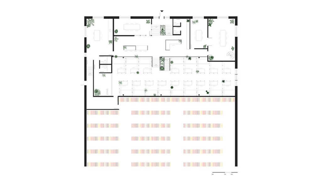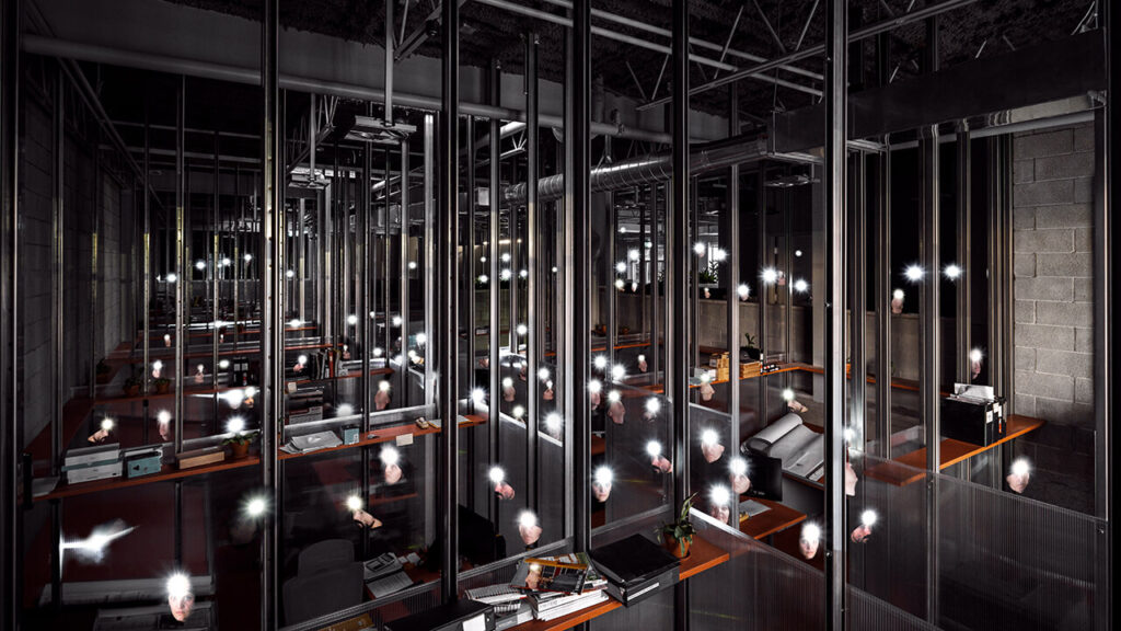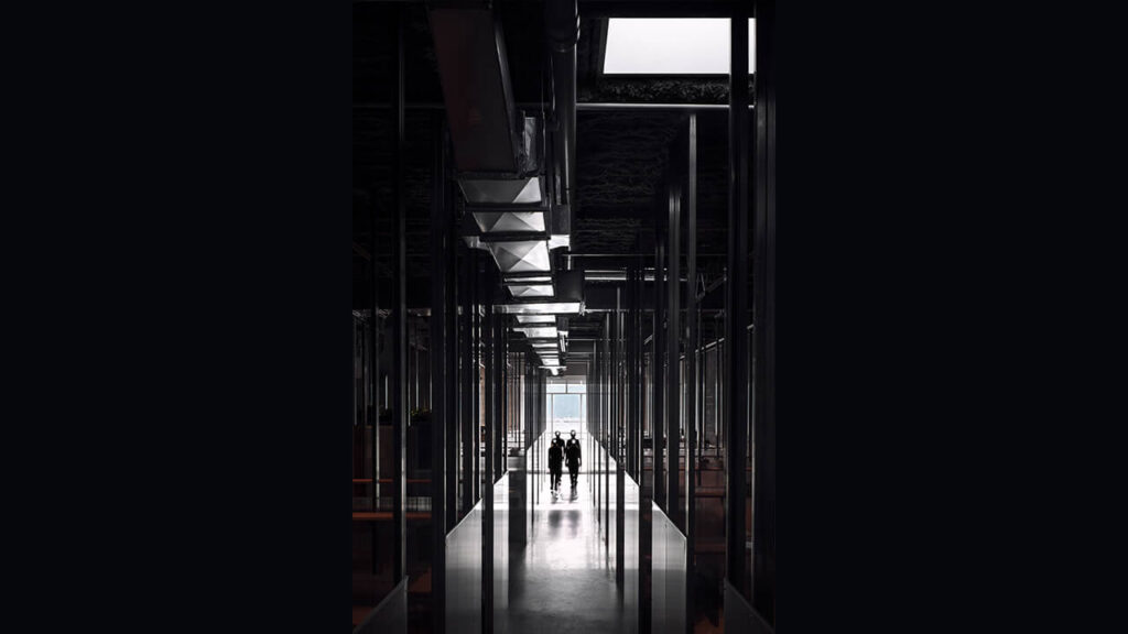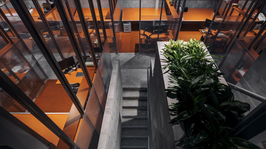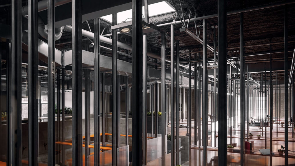 C’est le cas une fois de plus avec cet espace à bureaux aux allures quasi cinématographiques. Par ses symétries et son look industriel, ce concept osé ramène à l’essentiel les fonctions d’un tel lieu avec une expérience minimaliste, justifiée par la volonté de réduire l’impact environnemental de l’intervention dans un contexte d’urgence climatique. Nous apprécions d’ailleurs que ce projet ait permis la réhabilitation d’un bâtiment désaffecté datant des années 1980.