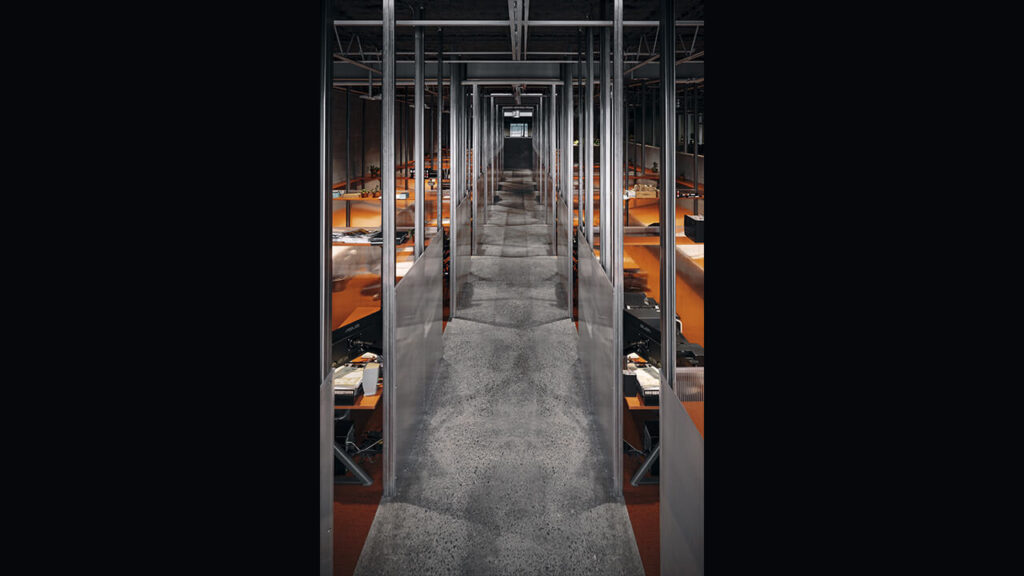 Priorisant une intervention architecturale à la scénographie assumée, et s’inscrivant dans une stratégie de minimisation de l’impact environnemental, le projet propose la réhabilitation d’un bâtiment industriel désaffecté des années 1980 afin d’y établir le siège social des Entreprises d’électricité E.G. Ltée, fondée en 1951. Par le déploiement de 250 membrures d’acier inoxydable, un imposant dispositif architectural organise les distances et les proximités, les circulations et les regroupements. Ces profilés métalliques, usuels dans le domaine électrique, permettent de fixer les cloisons, de supporter le mobilier, comme de camoufler tout le câblage. Cette profusion d’éléments compose une trame irrégulière qui marque l’espace de tracés verticaux structurant les délimitations spatiales. Le caractère industriel, offert par les surfaces brutes du béton, la brillance de l’acier inoxydable et les cloisons translucides s’unifiant dans une entité dynamisée par des accents de couleur orangé, charge l’espace d’une cohésion esthétique soulignant la ré-interprétation du concept de bureau paysager. À la fois dépouillé et expressif, EG propose un environnement s’amusant d’accumulation et de démesure pour stimuler l’expérience participative s’inscrivant dans le quotidien de ses usagers.