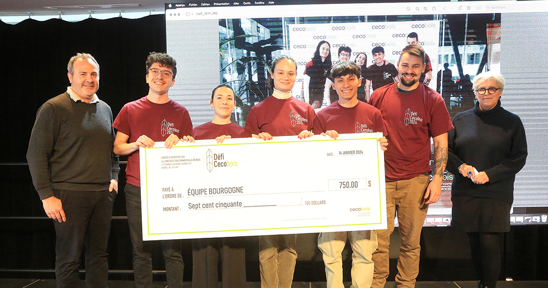Équipe Bourgogne, lauréate du 1er prix | DE GAUCHE À DROITE : Louis Poliquin, directeur de Cecobois, Jean-Simon Bissonnette (Université de Montréal), Camille Brodeur (Université de Montréal), Rosalie Tremblay (Université de Montréal), Julian Jeri Di Carlo (École Polytechnique de Montréal), Dylan Dupéré (Université du Québec à Chicoutimi) et Sonia Gagné, associée chez Provencher Roy | Crédit photo : Cecobois