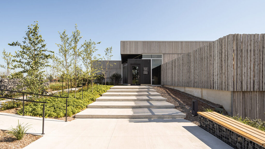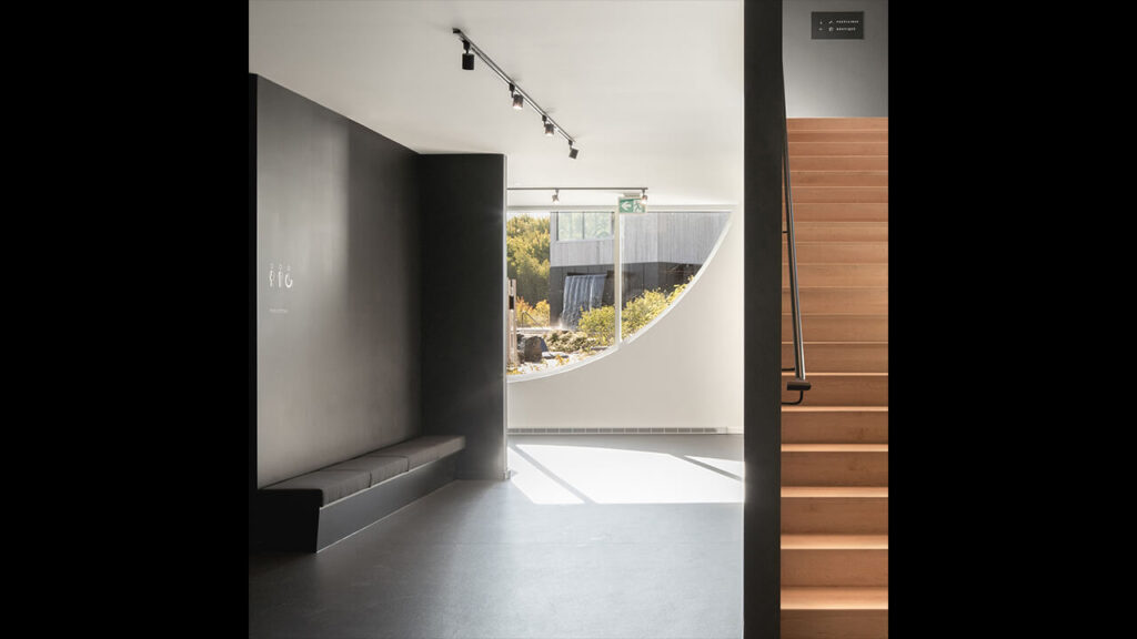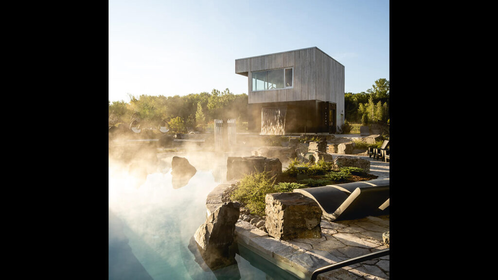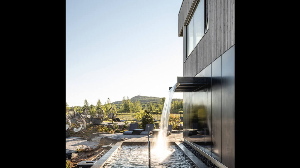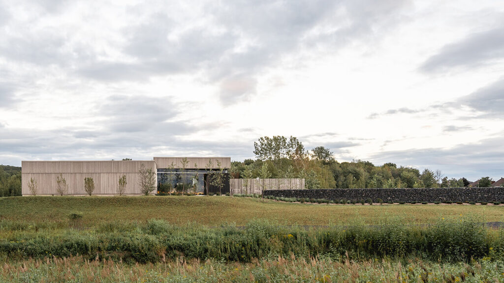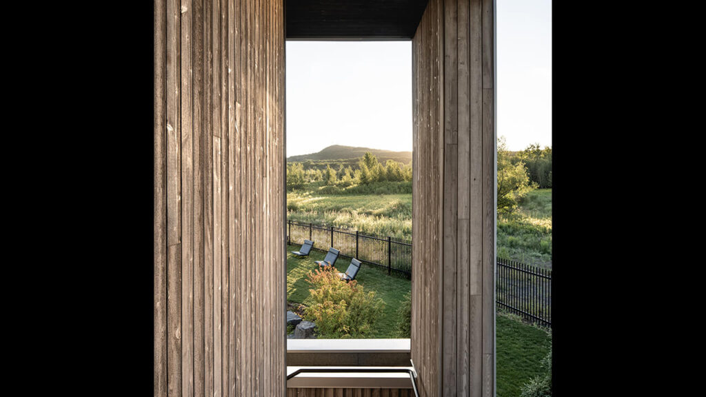 Tout d’abord, par ses lignes sobres – mais non simplistes – qui se veulent un habile clin d’œil vernaculaire aux bâtiments de ferme du voisinage. L’intégration au milieu naturel est sublime, notamment grâce à l’utilisation de matériaux comme le bois de cèdre et la pierre (provenant de la carrière voisine !), en plus de l’aménagement paysager réfléchi en toute cohérence avec l’architecture. L’ensemble « transpire » la tranquillité et la détente, tout en permettant aux visiteurs de se reconnecter à la nature qui l’entoure.