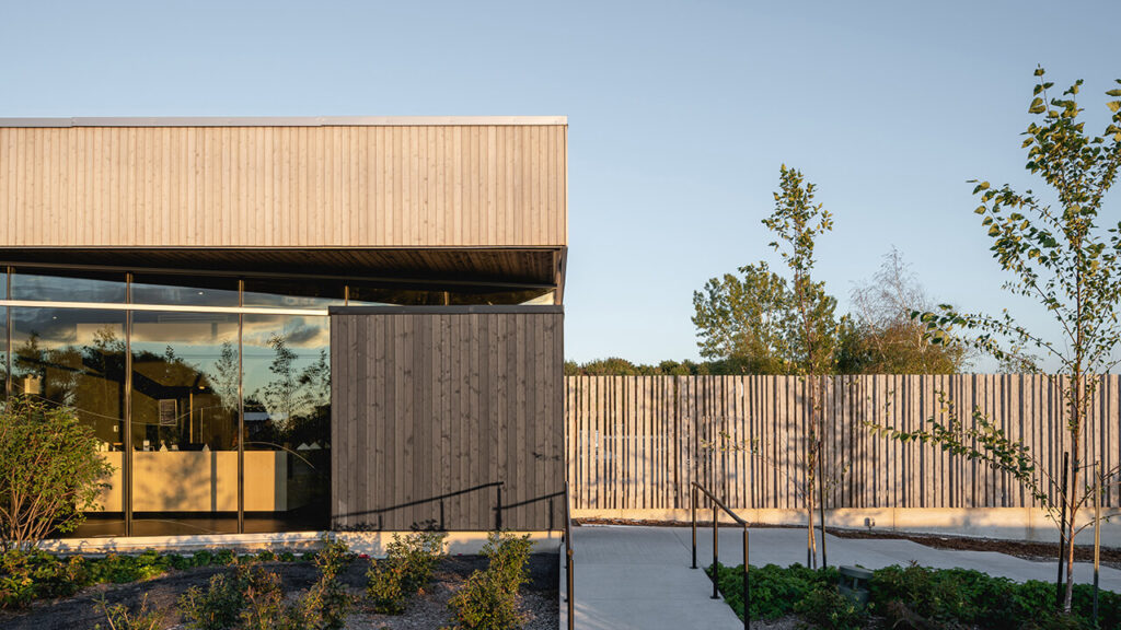En partenariat avec le client, FÖRENA est le fruit d’une réflexion programmatique rigoureuse ayant pour objectif de définir d’une part les besoins initiaux et d’autre part la prévision des développements futurs. Stratégiquement implantés, les bâtiments sont tous conçus pour soutenir la première phase du projet, mais aussi pour devenir éventuellement les portes d’entrée aux futures installations. La pérennité de l’ensemble et le souci d’une cohérence à long terme ont contribué au développement d’une architecture immuable pouvant s’adapter à différents scénarios de développement. Monochromes et prismatiques, les volumes de bois de cèdre naturel sont ponctués de boîtes noires; des vestibules accueillant le visiteur et le guidant dans ses différentes découvertes et expériences. Chaque pavillon peut donc offrir des thématiques différentes dans un cadre architectural cohésif et compréhensible. Clin d’œil vernaculaire aux bâtiments de ferme des terres agricoles voisines, le revêtement de cèdre argenté rappelle l’histoire du lieu tout en contribuant à l’utilisation de ressources locales et durables.