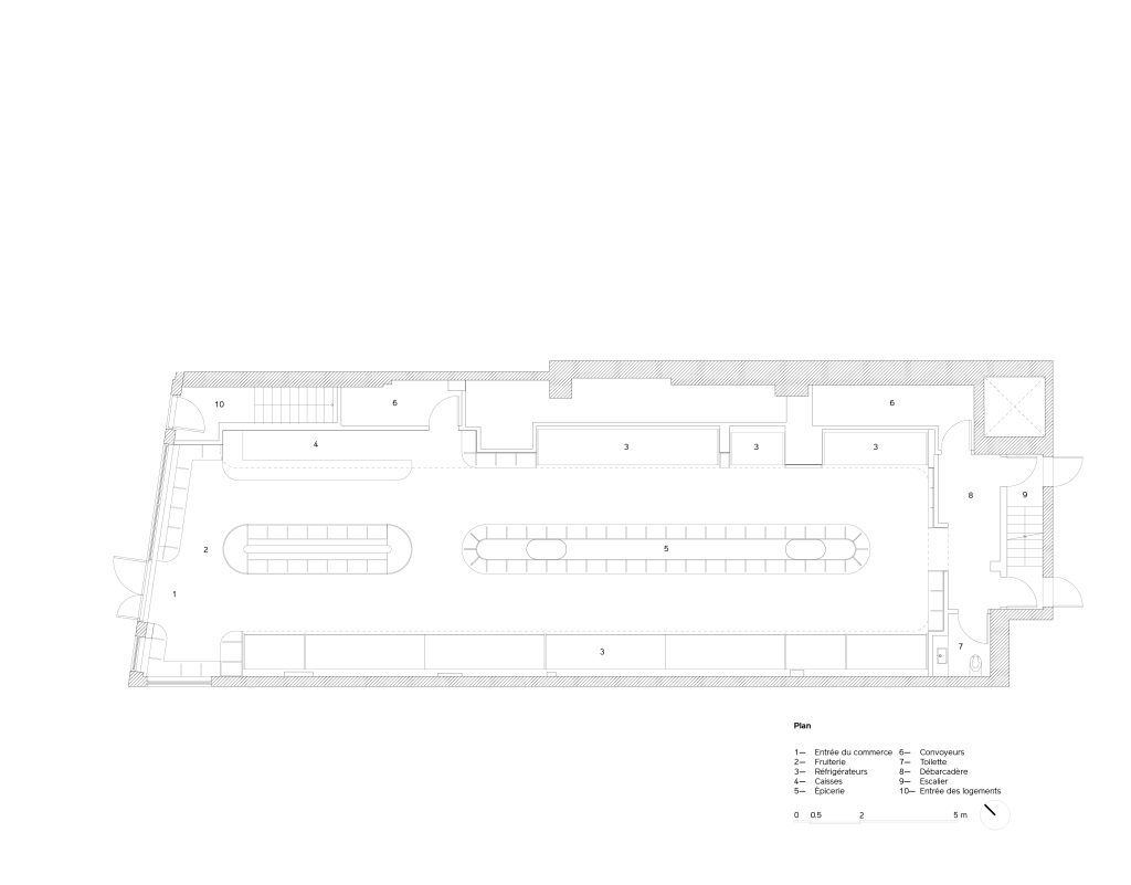 Le design favorise la lumière naturelle le plus possible. La façade vitrée de l’épicerie laisse entrer la lumière extérieure et l’orientation nord baigne le commerce d’une douce luminosité sans nuire aux aliments. Le long des fenêtres, un mobilier bas expose en vitrine certains produits tout en permettant d’en voir d’autres plus loin dans le magasin. Depuis la rue, notre regard plonge dans la fruiterie, attiré par les couleurs, la mise en place et l’effet de perspective générée par la profondeur du local. Depuis le magasin, les grandes baies vitrées et dégagées nous gardent en contact constant avec la rue et son effervescence, mimant l’ambiance animée des marchés publics.