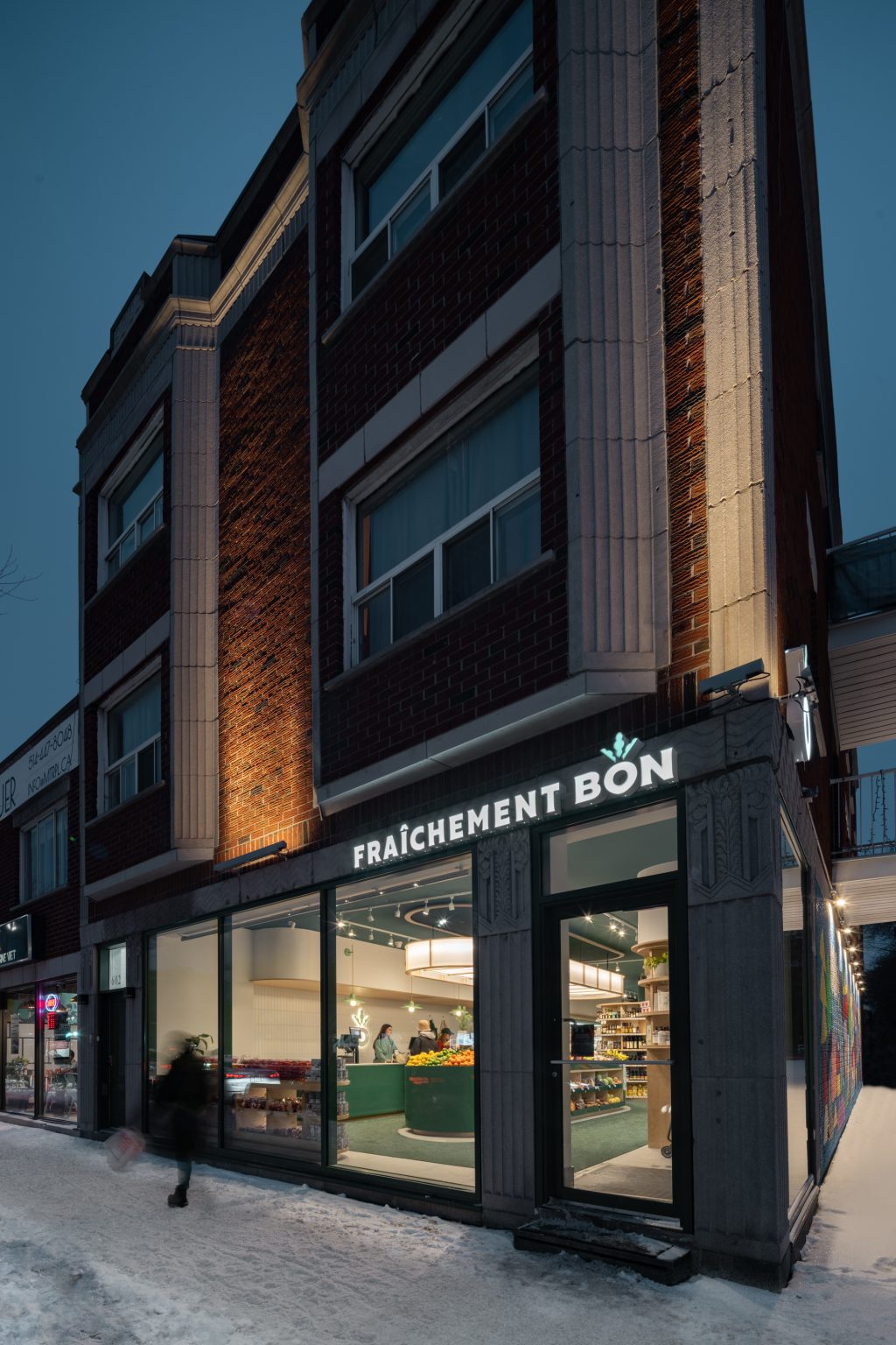 Fraîchement Bon Jarry repense le commerce de proximité à travers une esthétique plus résidentielle que commerciale. Les courbes du mobilier apportent une douceur et une convivialité qui contrastent avec les formes rectilignes propres aux espaces commerciaux. Un éclairage DEL aux couleurs plus chaudes a été choisi afin de rendre l’ambiance plus chaleureuse.