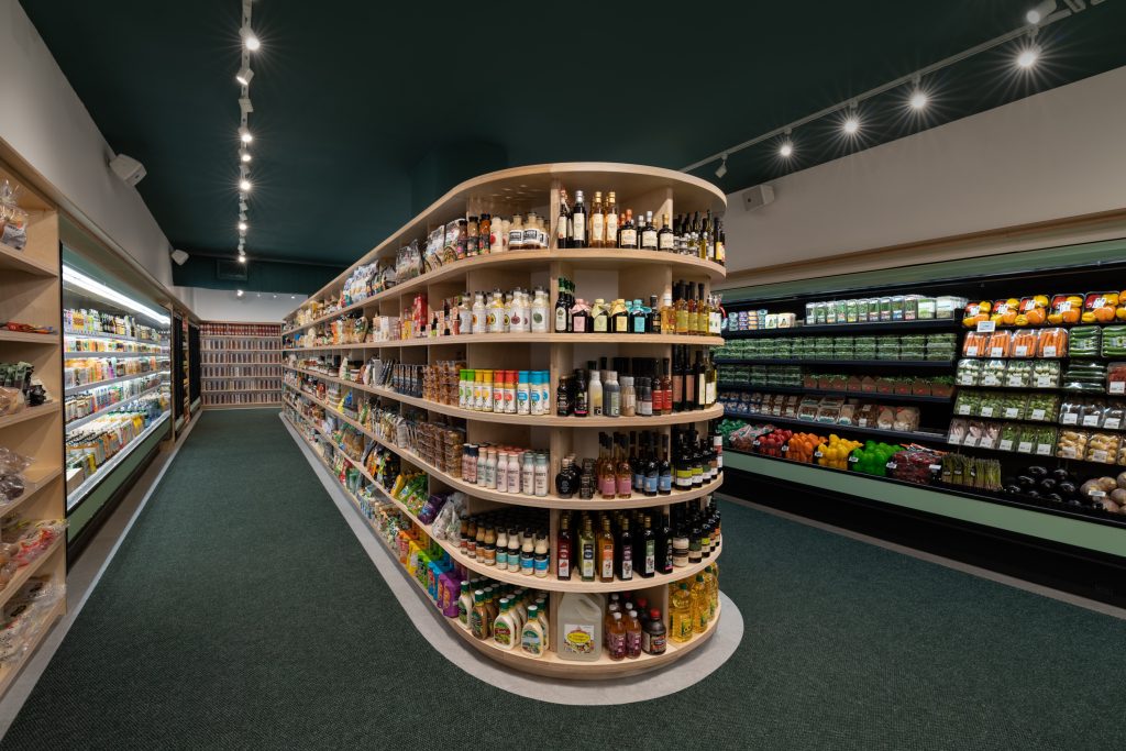 À la différence du premier concept d’épicerie où un immense réfrigérateur occupait le centre, les réfrigérateurs ont ici été placés en périphérie et le mobilier en contreplaqué se trouve au coeur de la fruiterie, et cache les colonnes de soutien du bâtiment. La trame dessinée par les 7 niveaux des étagères permet une lecture rapide des produits et contribue à la clarté et la simplicité de l’expérience de magasinage.