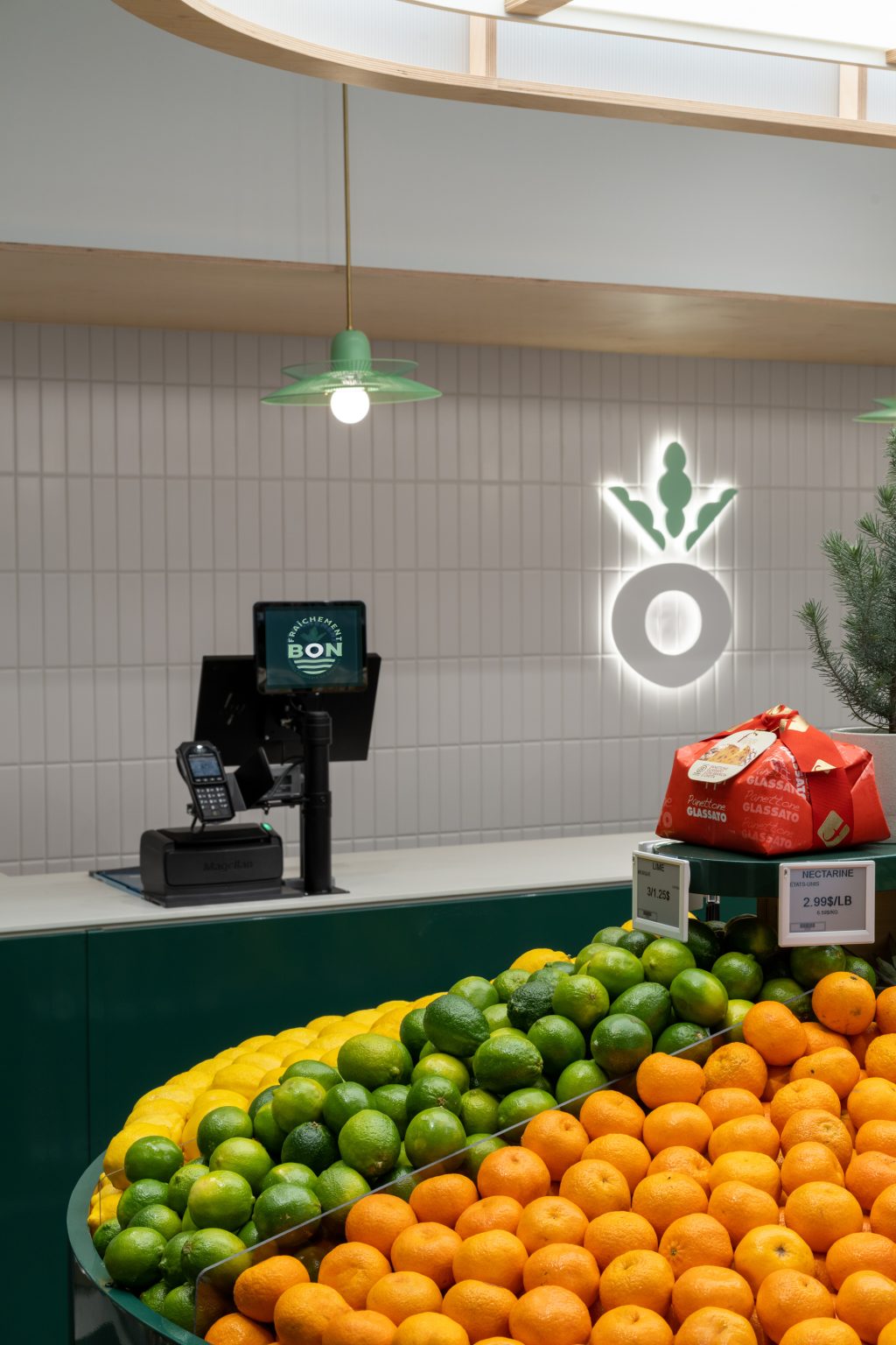 Située à un coin de rue de la station de métro Jarry, l’épicerie profite d’un emplacement de choix.Pour attirer la clientèle de passage, les architectes ont misé sur un design invitant à fort impact visuel. À travers les baies vitrées, un mobilier tel un grand plateau de fruits surmonté d’un luminaire tout en courbe, à l’image d’une lanterne suspendue, nous convie à entrer. Cet élément chaleureux résume à lui seul le concept développé par les architectes.