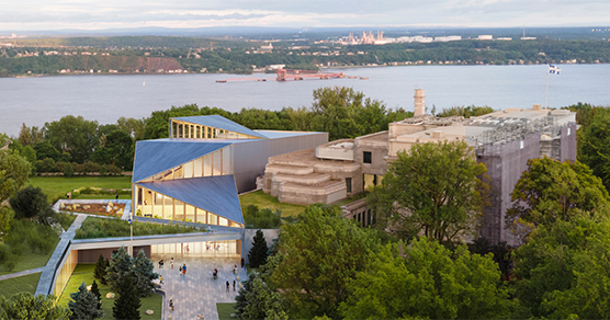 L’architecture se prêtera à de multiples lectures par son étagement en synergie avec les bâtiments environnants, évoquant tantôt l’atelier de l’artiste avec ses plafonds de bois, tantôt la nordicité et les paysages de L’Isle-aux-Grues, avec ses terrasses vertes aux essences variées. Baigné de lumière naturelle, le parcours proposé culminera avec l’espace circulaire consacré au chef-d’œuvre de Riopelle, L’Hommage à Rosa Luxemburg (1992), dont les hauteurs offriront un point de vue spectaculaire sur les plaines d’Abraham et sur le majestueux fleuve Saint-Laurent. »