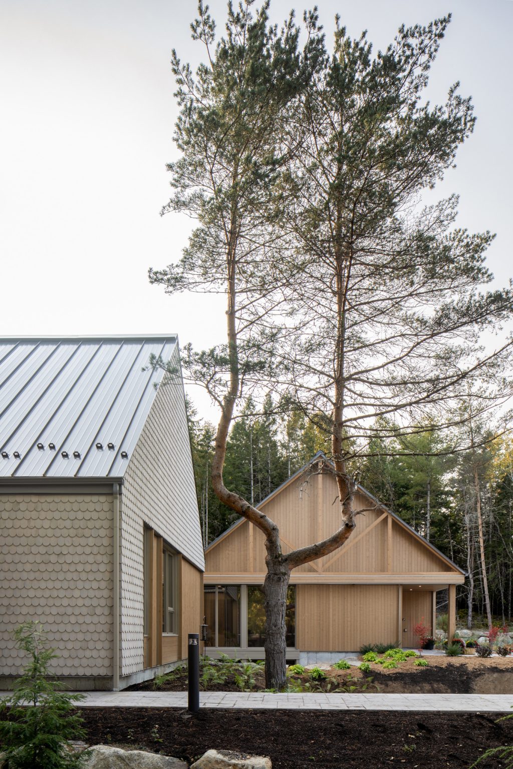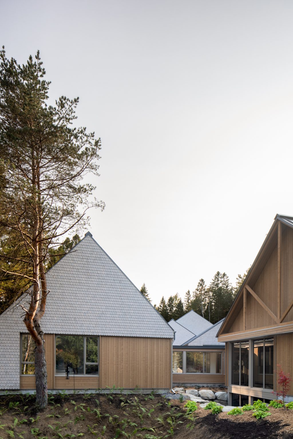 L’incorporation du bardeau de cèdre arrondi s’est rapidement imposée au cours du processus de conception, offrant une analogie subtile avec le plumage du hibou. Cette intégration confère au bâtiment une symbolique empreinte de réconfort.