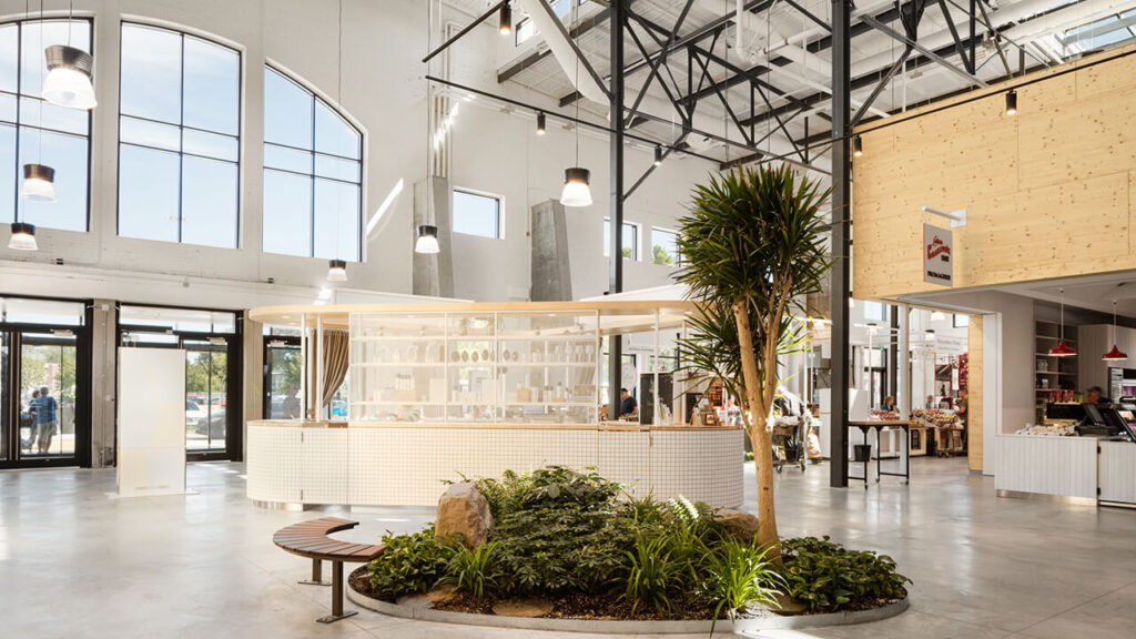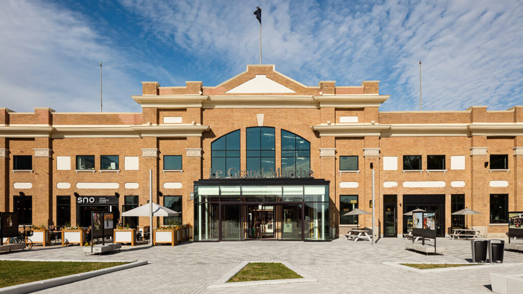 En créant une nouvelle destination culinaire, le Grand Marché est un projet rassembleur et porteur collectivement. Aménagé dans l’ancien Pavillon du Commerce, il met en valeur le patrimoine bâti en s’insérant délicatement entre la structure existante pour la magnifier. Le concept reprend l’idée d’une ville ou d’un village avec plusieurs petits bâtiments qui se glissent sur la rue principale, les rues secondaires, les ruelles et la grande place. À l’intérieur, la grande halle est baignée de lumière naturelle grâce à de grandes fenêtres s’ouvrant complètement sur la façade Sud. Les étals sont disposés le long de la façade Sud, en lien direct avec le marché saisonnier. À cela s’ajoutent plusieurs grands puits de lumière placés de manière stratégique à travers la structure du toit dans le marché. Les matériaux choisis se marient à l’environnement bâti et permettent aux produits locaux offerts par les divers marchands d’être mis en valeur. La mise aux normes complète a été faite en fonction des nouveaux usages et des exigences d’aujourd’hui.