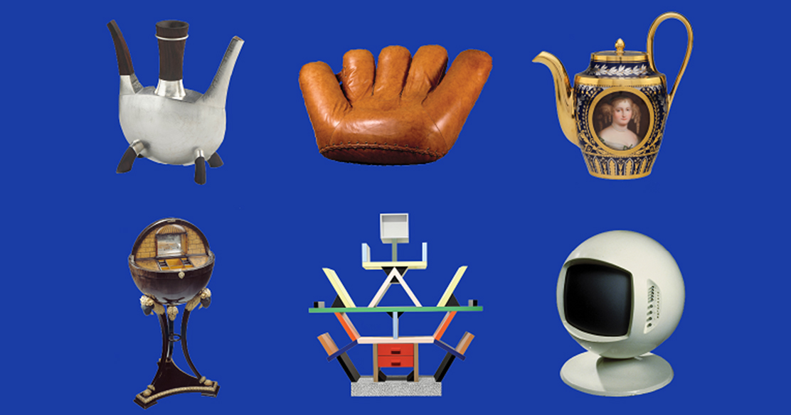 DANS LE SENS HORAIRE : Michael Massie (1962-), théière Chicoutés, airelles et thé, 2021, MBAM, achat, fonds de la famille T. R. Meighen. Photo MBAM, Jean-François Brière | Jonathan De Pas (1932-1991), Donato D’Urbino (né en 1935), Paolo Lomazzi (né en 1936), Canapé Joe, 1970, édité par Poltronova, Montale (Italie). MBAM, collection Liliane et David M. Stewart, don du Council for Canadian American Relations grâce à la générosité d’Eleanore et Charles Stendig, à la mémoire d’Eve Brustein et Rose Stendig. Photo MBAM | Manufacture de Sèvres (fondée en 1756), décor peint par Jean Georget (actif entre 1801 et 1823), Cabaret ou service à déjeuner dit des Femmes célèbres (théière), vers 1814. MBAM, achat, legs Suzanne Caouette. Photo MBAM, Jean-François Brière | Arthur D. Bracegirdle, Keracolor B1, 1969. MBAM, collection Liliane et David M. Stewart, don de Nannette et Eric Brill. Photo MBAM | Ettore Sottsass (1917-2007), bibliothèque Carlton, 1981. MBAM, don de Mieczyslaw et Jadwiga Marcinkiewicz. Photo MBAM, Julie Ciot | AUTRICHE, VIENNE, table à ouvrage Biedermeier en forme de globe, vers 1815-1820. MBAM, achat, fonds de la Deutsche Bank. Photo MBAM, Christine Guest