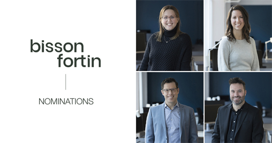 « Laval, le 5 mai 2022 – C’est avec un très grand enthousiasme que Bisson Fortin annonce la nomination d’Andréanne Dumont, Karine Gagnon, Michael Mueller et Daniel Vinet à titre d’architectes associés. La firme annonce également la nomination de Patrice McInnes et d’Evangelos Tzanetakos à titre de partenaires principaux.
