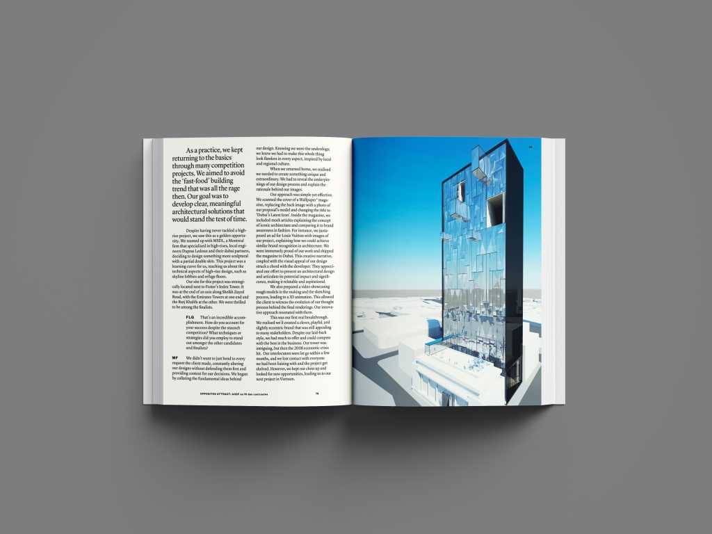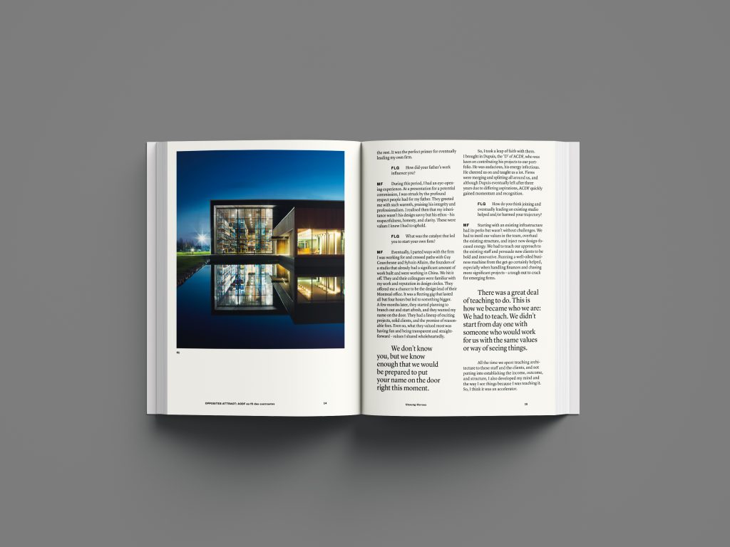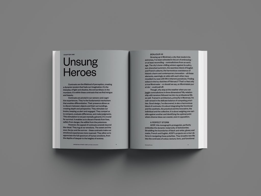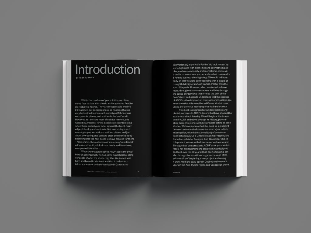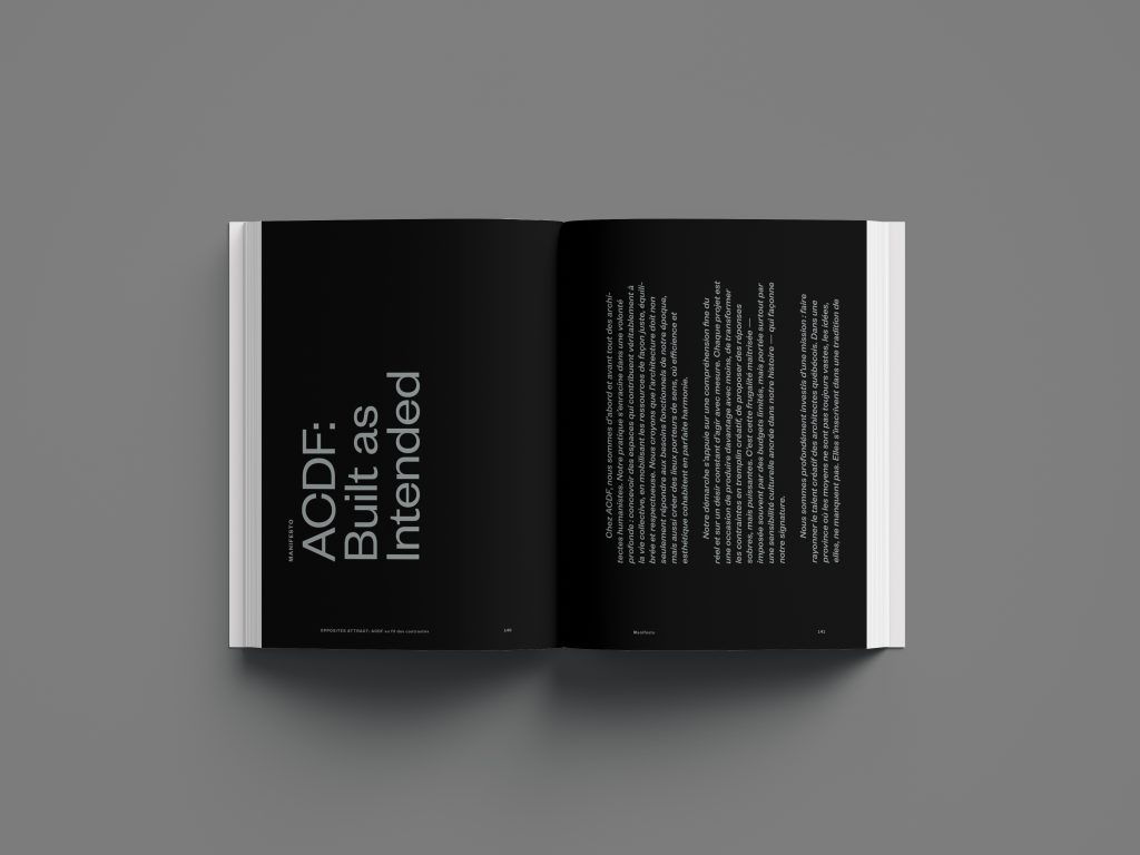 Intitulé Opposites Attract: ACDF au fil des contrastes, l’ouvrage propose une immersion dans l’univers du cabinet montréalais, à travers une grande conversation sans filtre qui explore les contrastes fondamentaux de sa pratique : rigueur et imagination, local et global, noir et blanc, français et anglais.