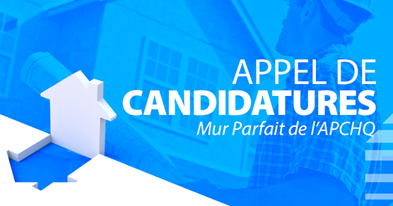 « Montréal, le 28 juin 2021 – L’Association des professionnels de la construction et de l’habitation du Québec (APCHQ) est à la recherche d’entrepreneures et d’entrepreneurs, provenant de toutes les régions du Québec, prêts à poser leur candidature pour participer à la phase 2 du projet du Mur parfait de l’APCHQ. Ainsi, dès maintenant et jusqu’au 11 août 2021 à midi, les entreprises œuvrant en construction résidentielle neuve pourront faire parvenir leur dossier de candidature par courriel.