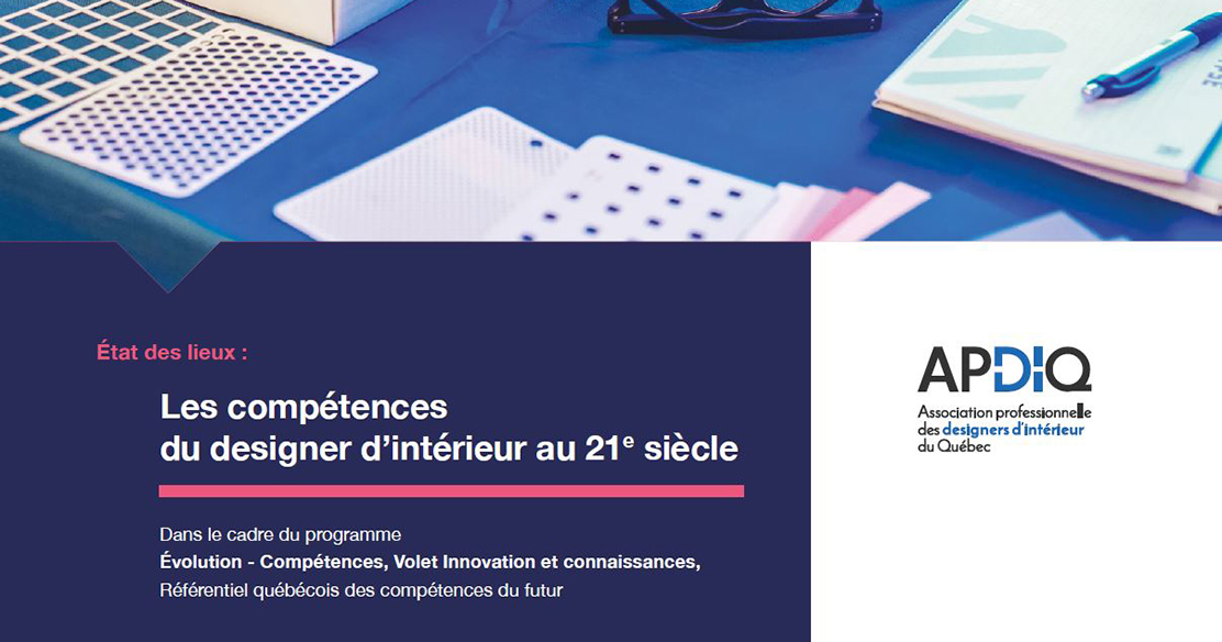 « MONTREAL, le 2 février 2024 – Dans le cadre du programme Évolution – Compétences, Volet Innovation et connaissance de la Commission des partenaires du marché du travail (CPMT), l’Association professionnelle des designers d’intérieur du Québec (APDIQ) publie un rapport intitulé État des lieux en matière de compétences du designer d’intérieur au 21e siècle.