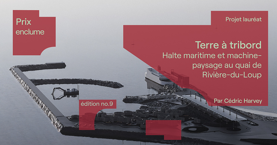 Le Prix Enclume édition 2025 est remis à Cédric Harvey, candidat à la maîtrise en architecture de l’Université Laval pour son essai-projet « Terre à tribord, Halte maritime et machinepaysage » qui prend place sur le quai de Rivière-du-Loup. Le projet s’intéresse à la terre comme matériau remanié, déplacé et réorganisé lorsque les forces d’érosion et de sédimentation sculptent le territoire. Le jury a apprécié l’approche artistique soutenue et présente tout au long de la réflexion. Cette réponse artistique à un enjeu géologique fait preuve d’originalité, en plus d’être bien ancrée dans son contexte géographique et social, étant donné la menace sur la traverse entre Rivière-du-Loup et Saint-Siméon.