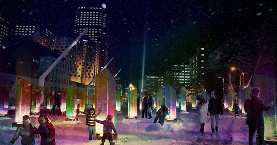 Montréal, le 16 octobre 2014 – Le Partenariat du Quartier des spectacles a dévoilé aujourd’hui les deux créations qui seront présentées lors de la cinquième édition de Luminothérapie, du 10 décembre 2014 au 2 février 2015. La place des Festivals sera mise en valeur par un gigantesque kaléïdoscope intitulé Prismatica qui sera conçu par la firme d’architecture torontoise RAW Design. C’est la première fois qu’un lauréat de ce concours provient de l’extérieur du Québec. Les huit façades du Quartier seront quant à elles animées par une fête foraine numérique appelée Fascinoscope imaginée par Lüz Studio, une entreprise de conception visuelle de Montréal. Grande nouveauté cette année : l’interaction avec le public sera poussée encore plus loin grâce à un dispositif qui permettra de jouer à des jeux sur la surface de projection adjacente à la station de métro Saint-Laurent.