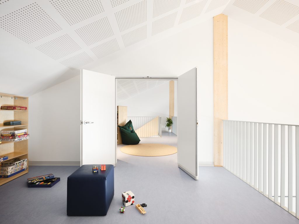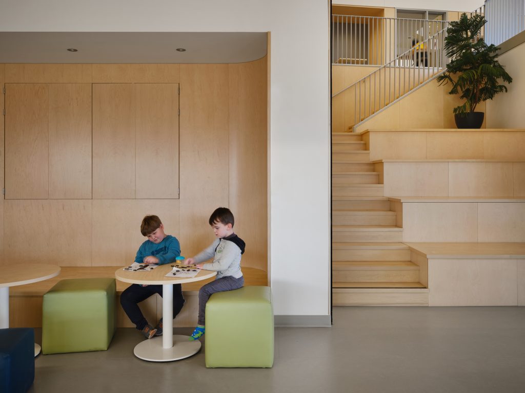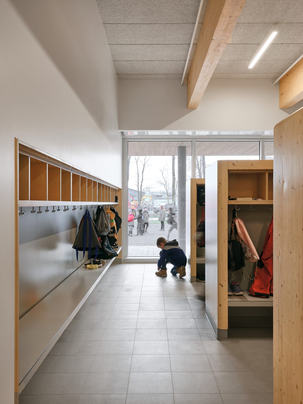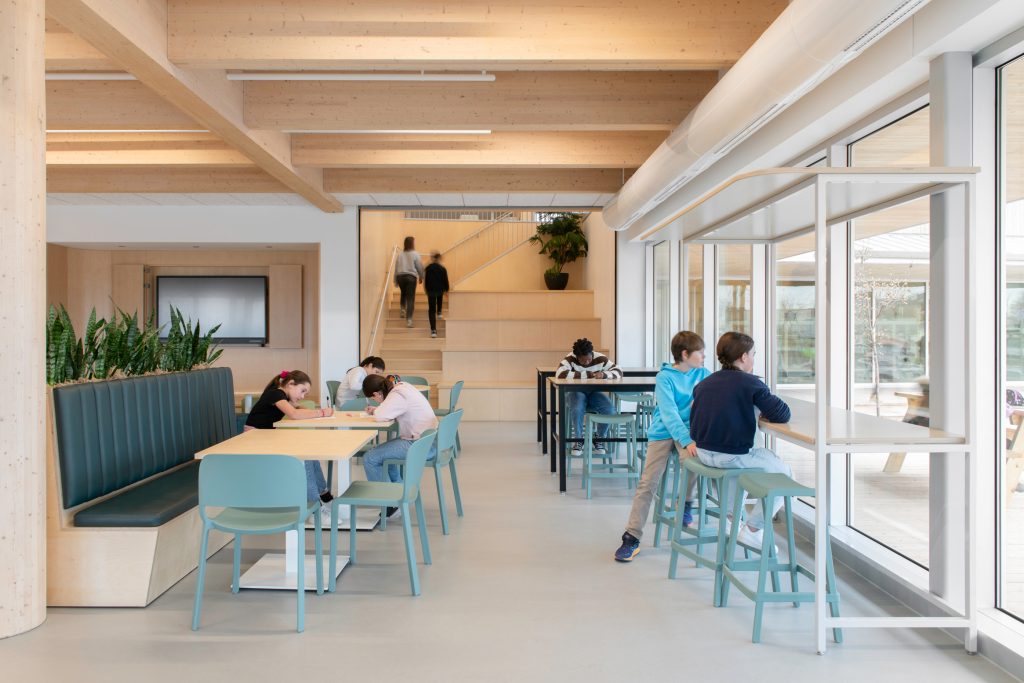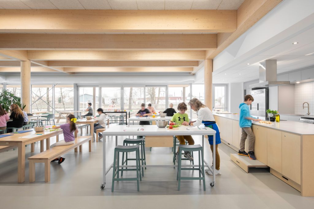 Au centre de l’école, la salle à manger offre un lieu de rassemblement convivial et lumineux. Cet espace dispose d’une cuisine ouverte et de liens directs avec la cour de récréation, le préau et les jardins. L’école des Cerisiers se distingue par son programme éducatif qui intègre l’alimentation aux activités scolaires, utilisant les récoltes pour cuisiner et apprendre, tout en sensibilisant les élèves à l’importance des produits locaux.