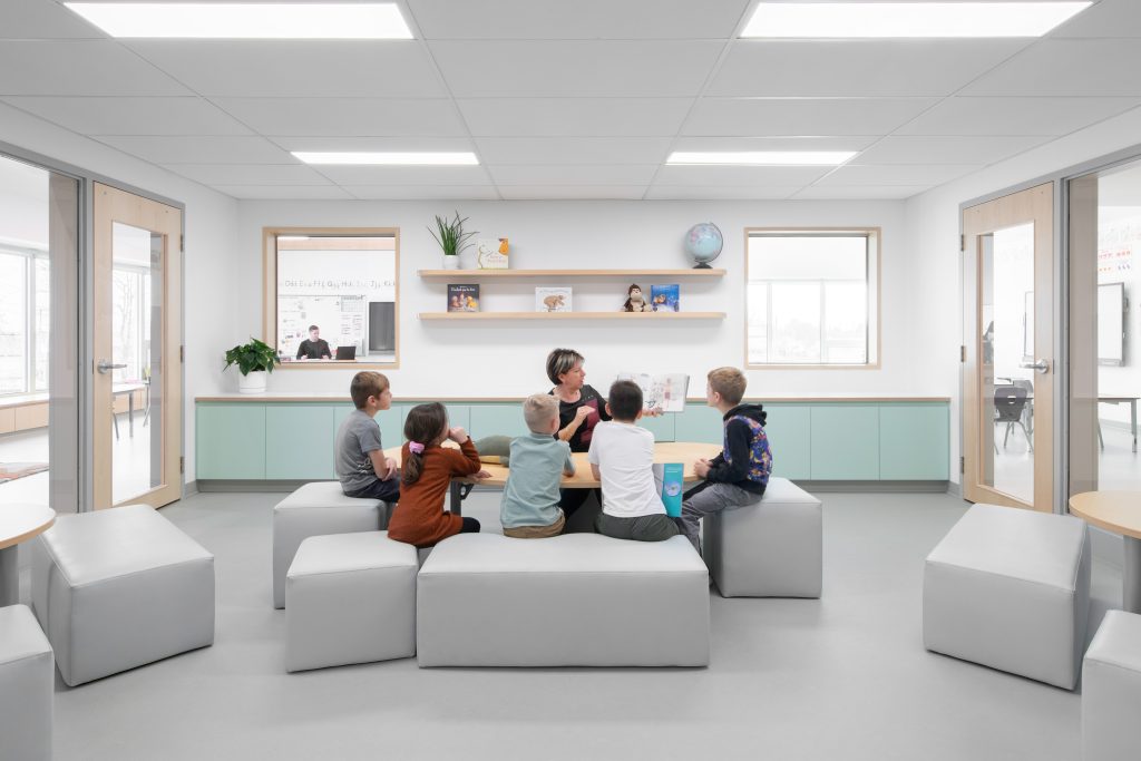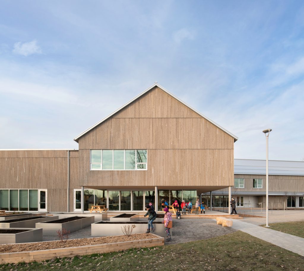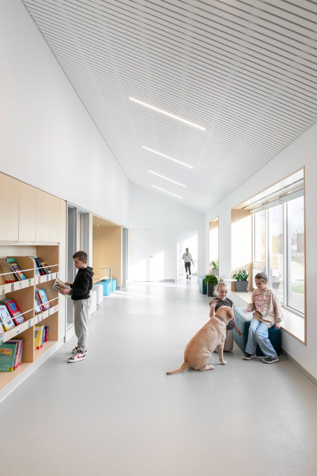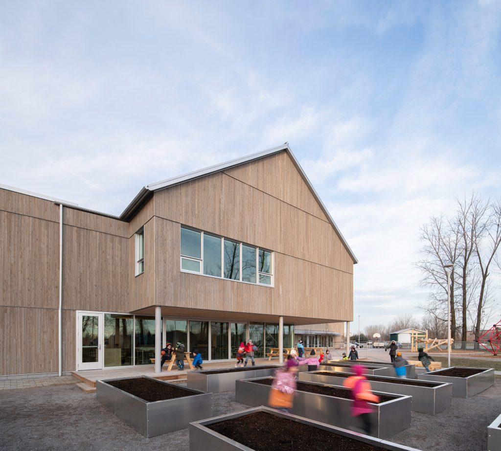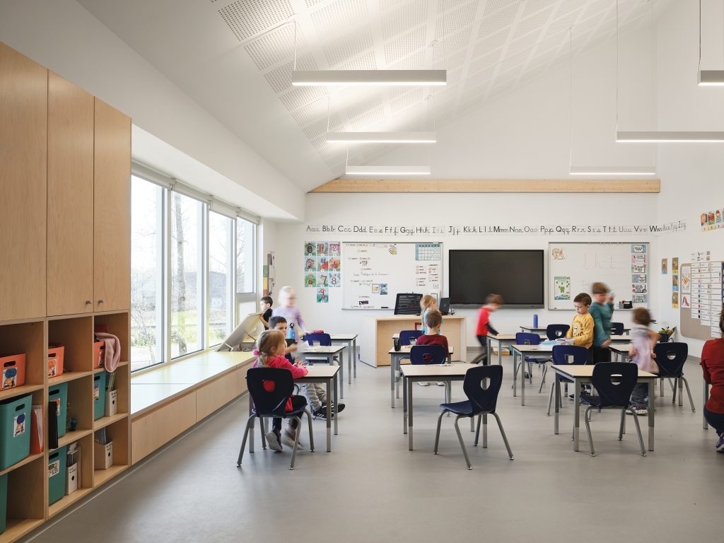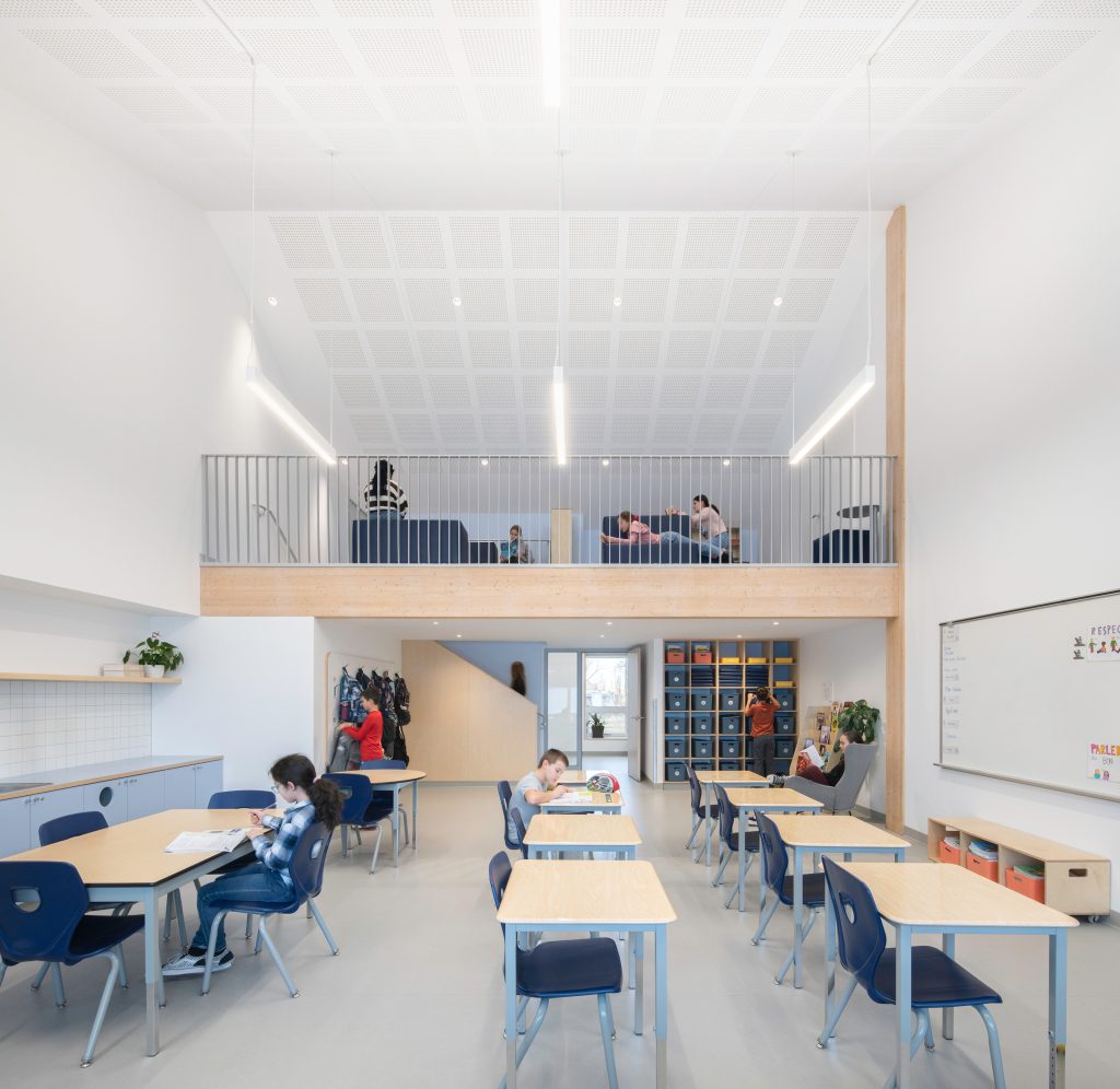 D’autre part, la multiplicité des espaces pédagogiques autant à l’intérieur (corridor habité, bibliothèque éclatée, etc.) qu’à l’extérieur (potager, classe à ciel ouvert, etc.) crée un environnement flexible et très stimulant pour les occupants, en plus de rentabiliser l’ensemble de l’école. Le décor épuré génère une atmosphère de détente, qui favorise la concentration et l’apprentissage.