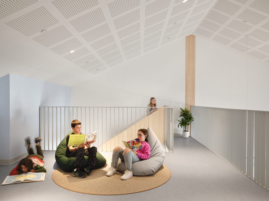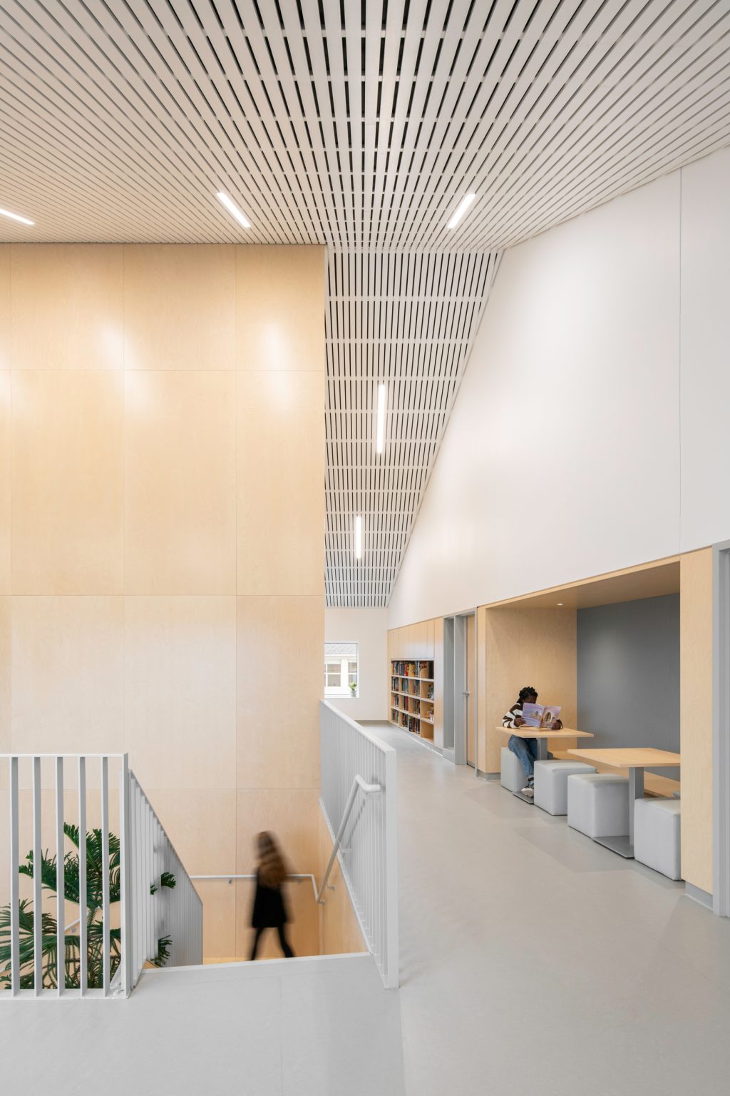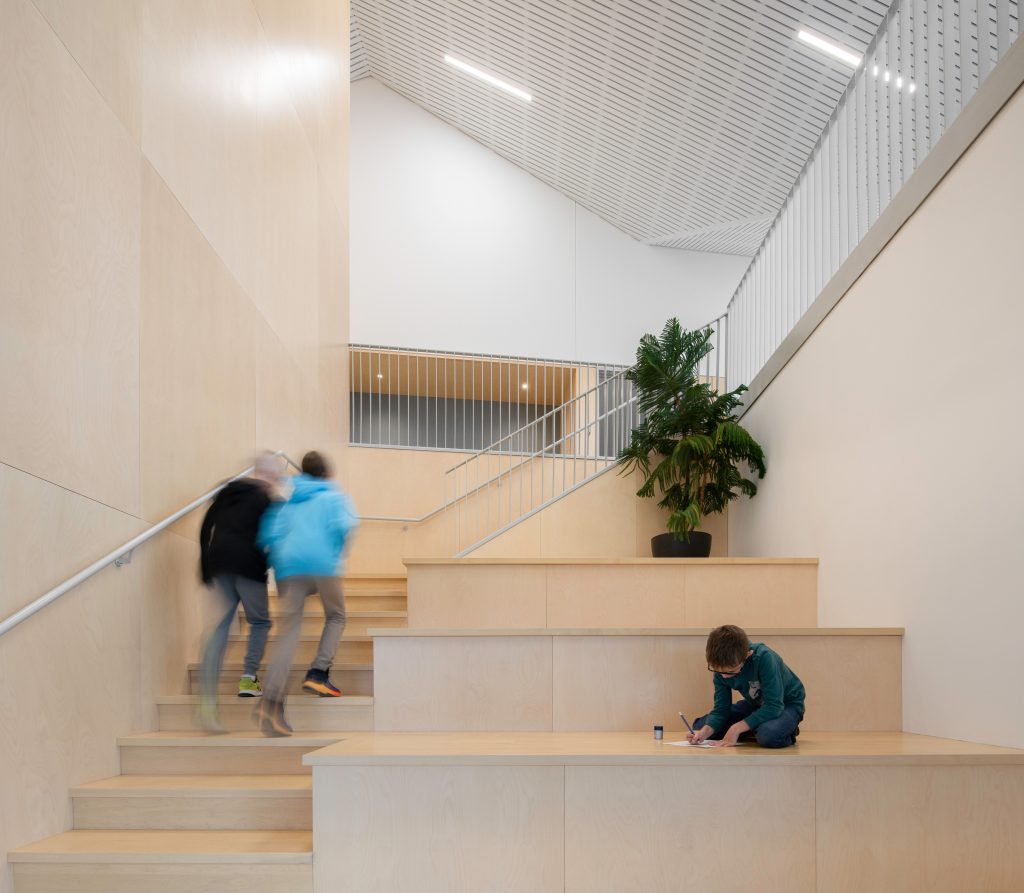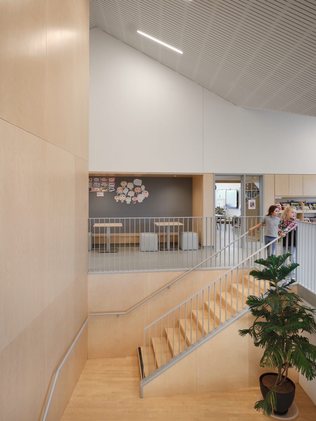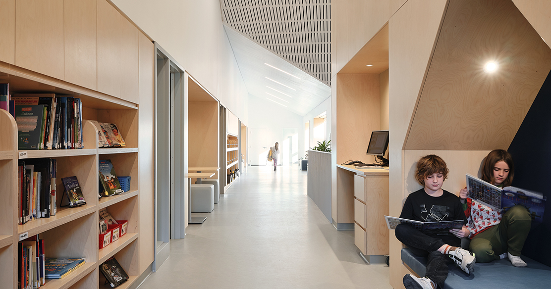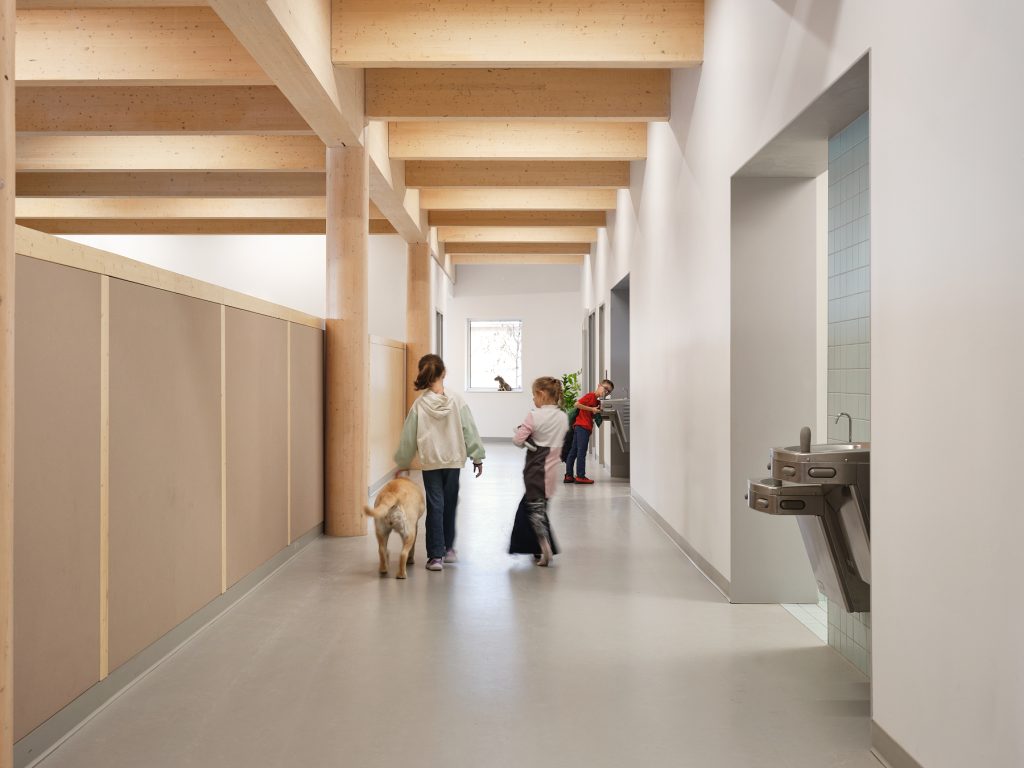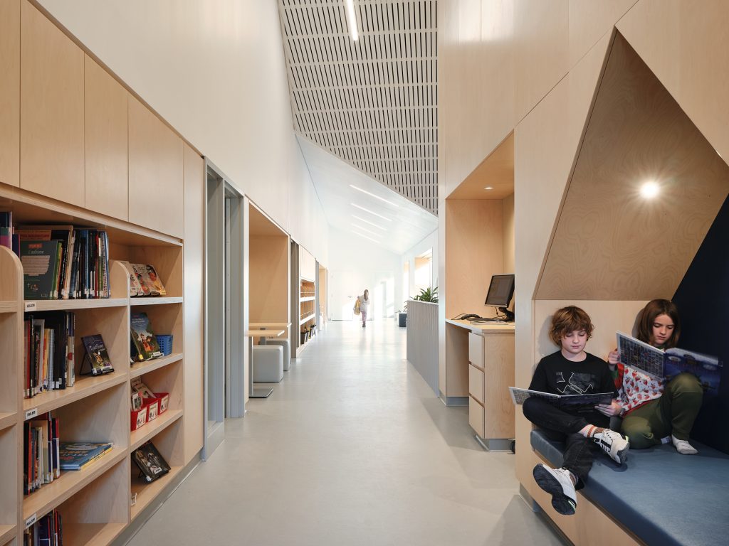 D’autre part, la multiplicité des espaces pédagogiques autant à l’intérieur (corridor habité, bibliothèque éclatée, etc.) qu’à l’extérieur (potager, classe à ciel ouvert, etc.) crée un environnement flexible et très stimulant pour les occupants, en plus de rentabiliser l’ensemble de l’école. Le décor épuré génère une atmosphère de détente, qui favorise la concentration et l’apprentissage.