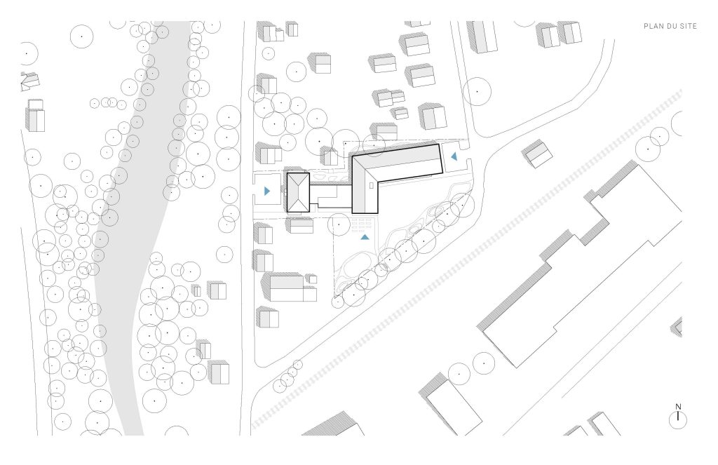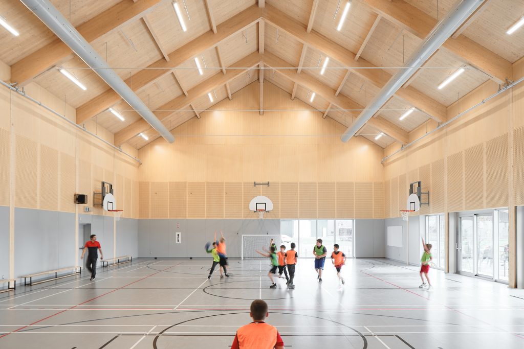 D’une part, le bâtiment se marie habilement avec le contexte local, faisant écho aux granges du secteur (forme et matérialité) et des galeries couvertes des maisons avoisinantes (préau autour de l’école).