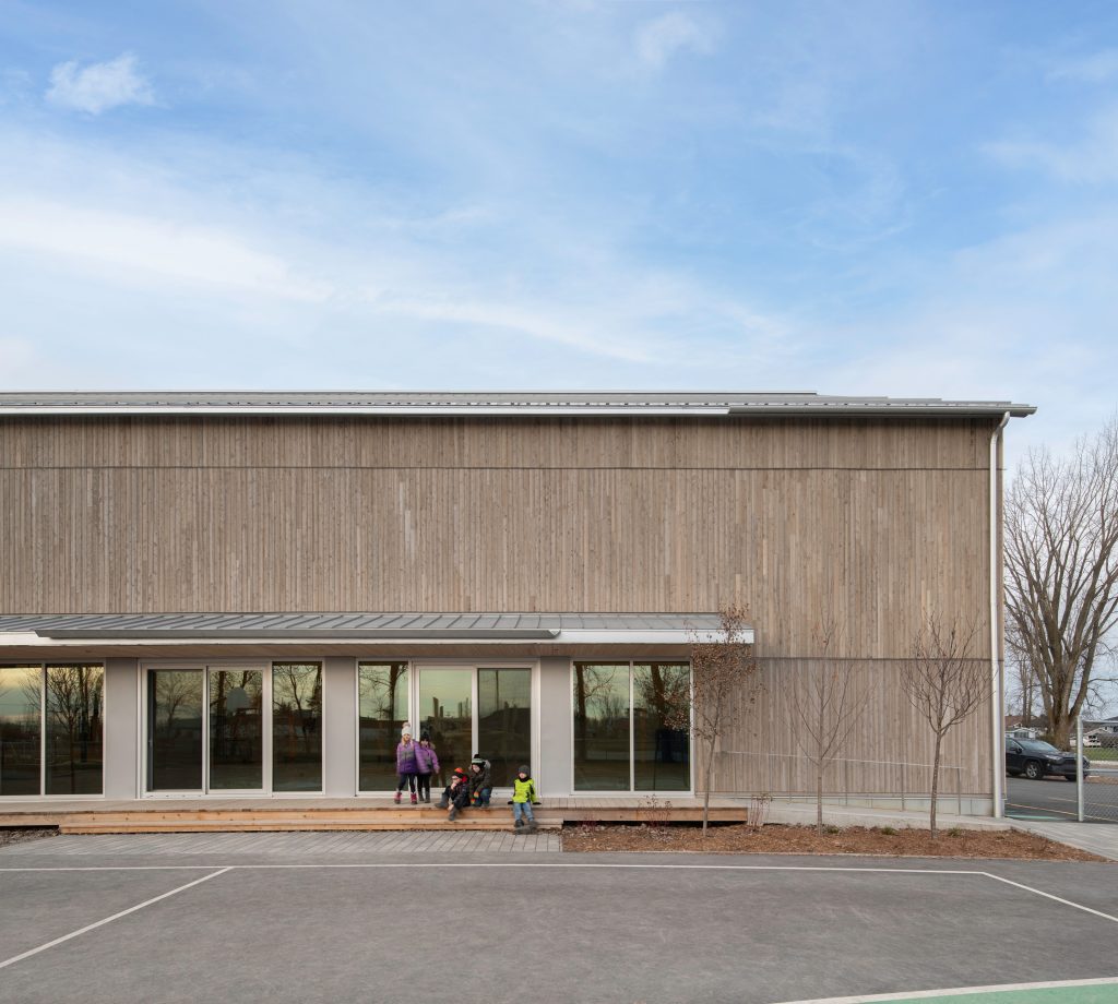 Situé au cœur de la municipalité de Maskinongé, le projet d’agrandissement de l’école primaire des Cerisiers visait à accueillir sous un même toit tous les élèves du village. Inspiré par le modèle de la rue d’apprentissage, ce projet offre la création d’un parcours éducatif à l’échelle du site. Avec sa configuration linéaire, le nouveau bâtiment occupe une présence distincte sur chacune des trois rues environnantes. Cette disposition structure les fonctions principales de l’école et multiplie les accès au bâtiment, créant ainsi un environnement accueillant pour les élèves et ouvert à la communauté.