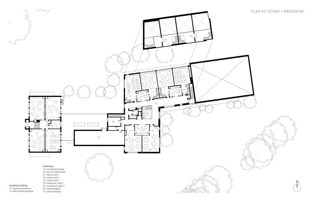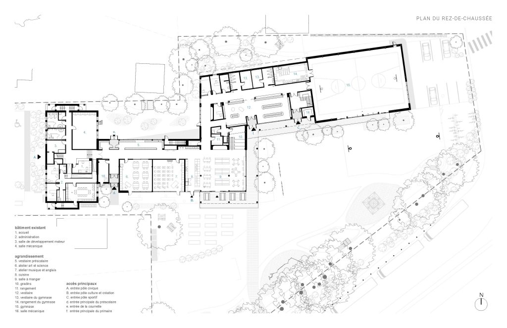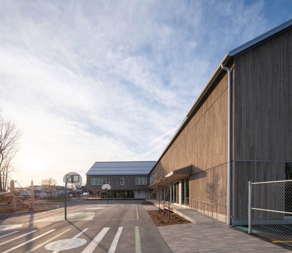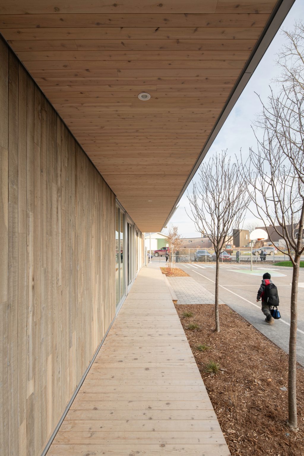 Les espaces extérieurs sont utilisés à leur plein potentiel pour offrir un environnement sain et verdoyant aux élèves et à la communauté, avec une variété de lieux de rencontre, de jeux et de découvertes. Bordée de grands peupliers matures, la cour ensoleillée est traversée par des axes de circulation menant à la galerie couverte où les élèves se rassemblent. Le nouveau gymnase, par sa position stratégique, offre des ouvertures sur les jeux sportifs extérieurs et permet un accès aux résidents du village en dehors des heures de cours.