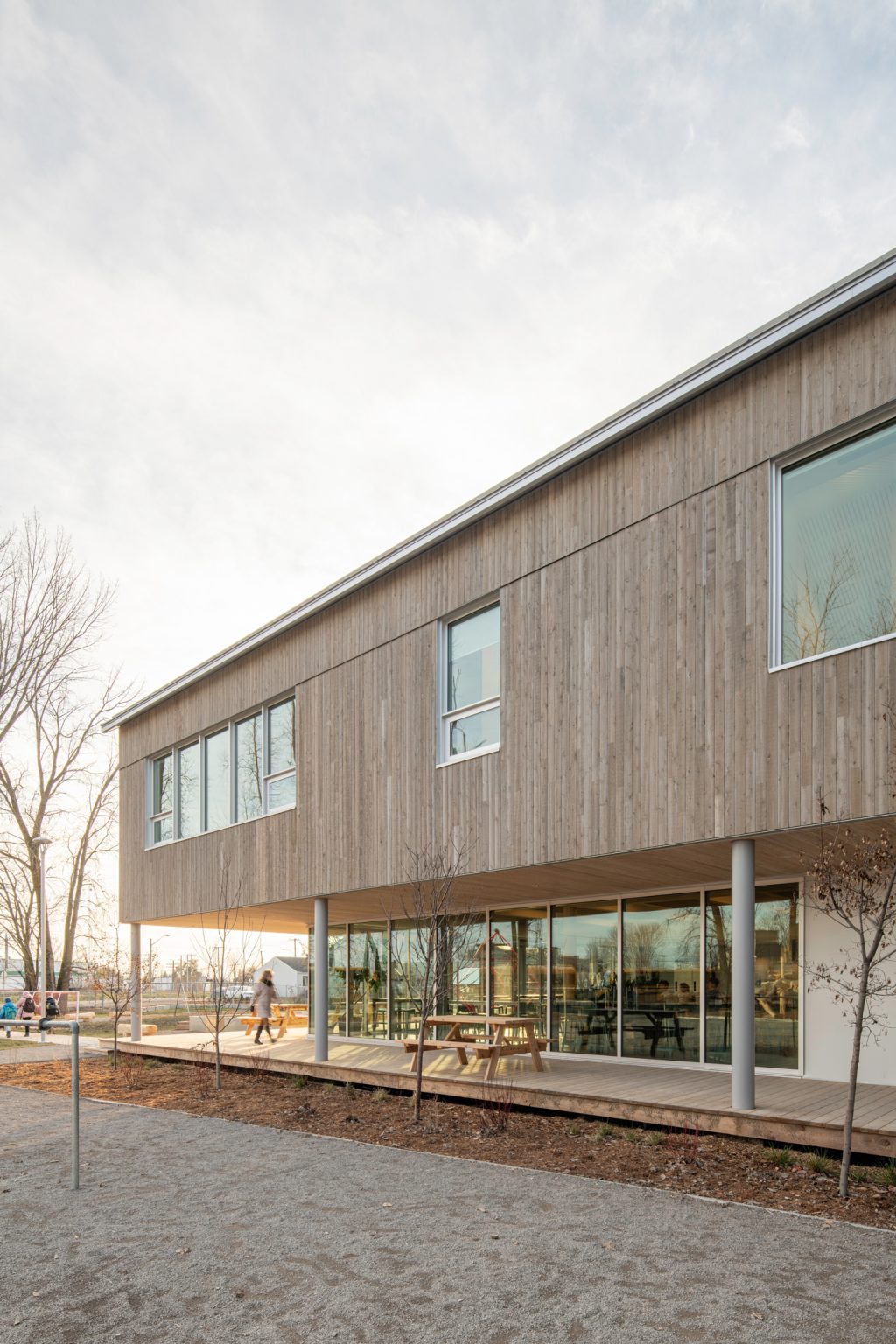 Inspiré par l’architecture vernaculaire de la région, le projet se caractérise par une simplicité formelle, par son échelle intime et son grand toit à double versant qui s’intègre harmonieusement au contexte du village de Maskinongé. L’utilisation prédominante du bois, autant pour la charpente que pour les finitions intérieures, contribue au rayonnement des ressources et du savoir-faire local tout en favorisant la création d’espaces d’apprentissages appropriables et inspirants.