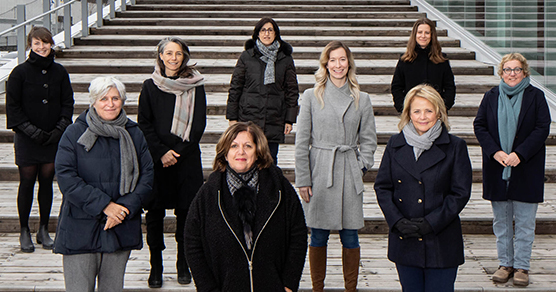 AU PREMIER PLAN, DE GAUCHE À DROITE : Sonia Gagné, Architecte Associée – Provencher_Roy, Sylvie Vachon, Présidente et CEO – Port de Montréal, Marie-Claude Leroux, Vice-présidente, affaires juridiques et immobilières, secrétaire corporative – Port de Montréal || AU DEUXIÈME PLAN, DE GAUCHE À DROITE : Sophie Wilkin, Architecte – Provencher_Roy, Josée Labelle, Architecte de paysage – NIPPAYSAGE, Nora Menasria, Ingénieure – Port de Montréal, Kimberley Thouin, Ingénieure en structure – NCK, Valérie Bier, Architecte – Provencher_Roy, Carole Nuttall, Conseillère en environnement – Port de Montréal
