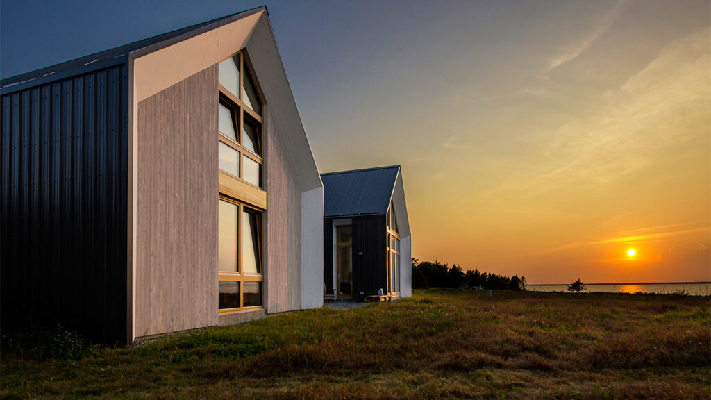 Les Jumelles sont à la fois une retraite dans la nature face à la mer et un projet d’insertion architectural dans le contexte du village historique acadien qu’est Caraquet, à quelques centaines de mètres de l’église du village et à moins de 60 mètres de sa plage de sable fin.