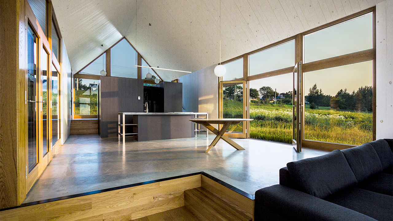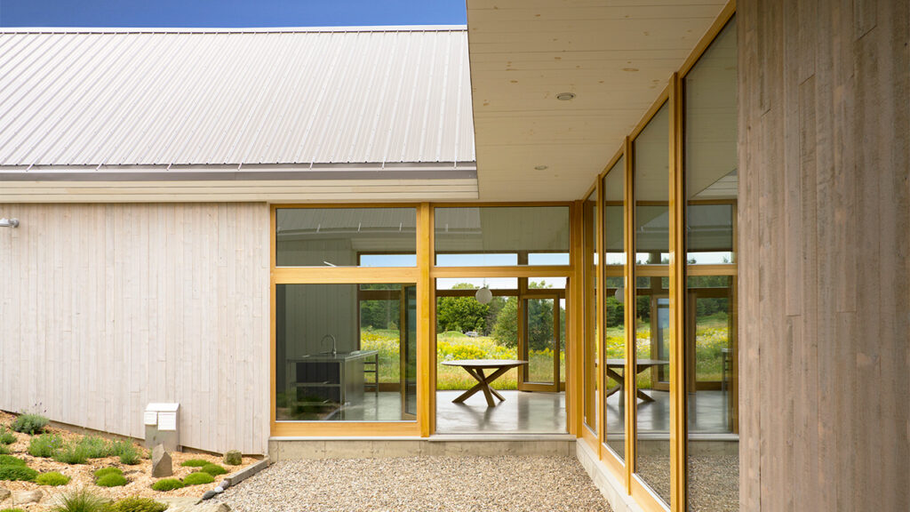 Architecture sobre et dépouillée, inspirée de l’architecture vernaculaire acadienne, elle se compose de deux corps de bâtiments jumeaux, petites constructions sous pignons faits de tôle et de bois déposés directement au sol dans une des dernières clairières naturelles du village.