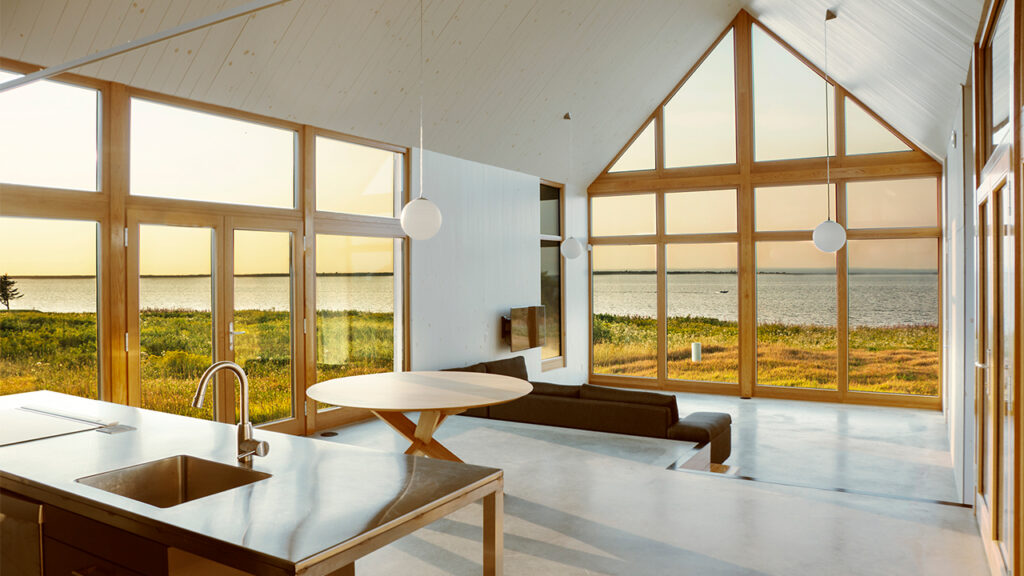 Maisons sœurs, typiques de l’architecture acadienne, elles sont implantées parallèlement l’une par rapport à l’autre et reliées entre elles par un passage vitré, déambulatoire servant aussi de bureau panoramique face à la mer.