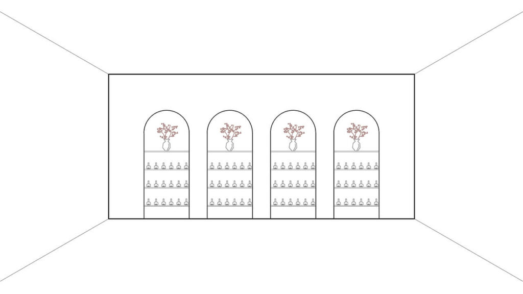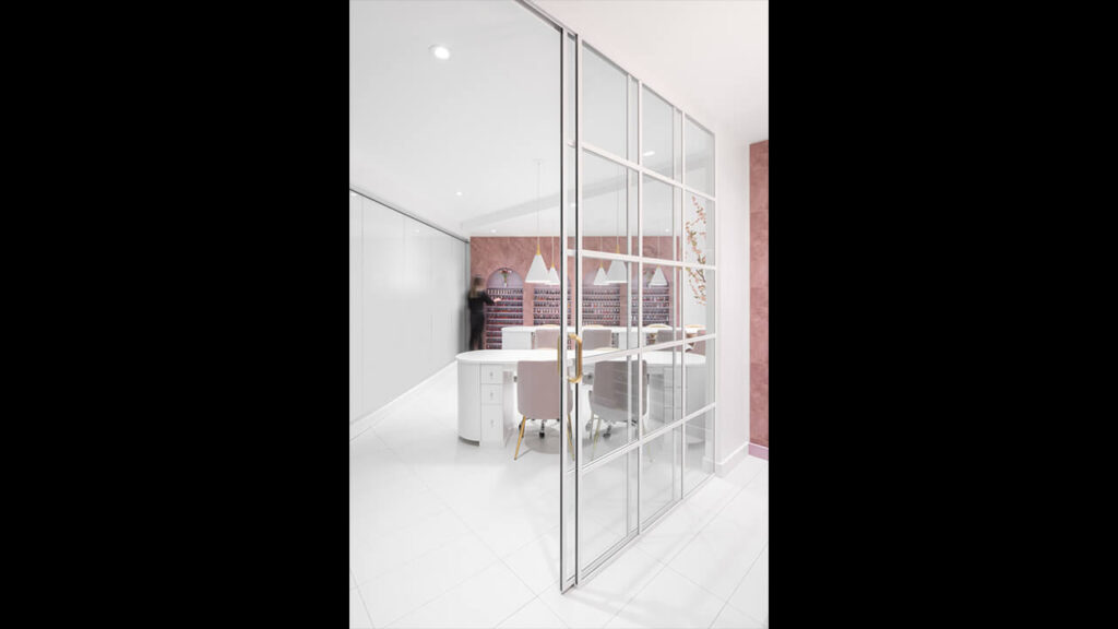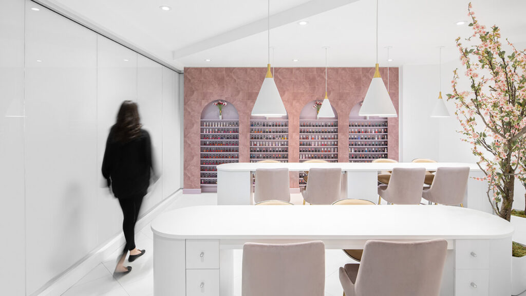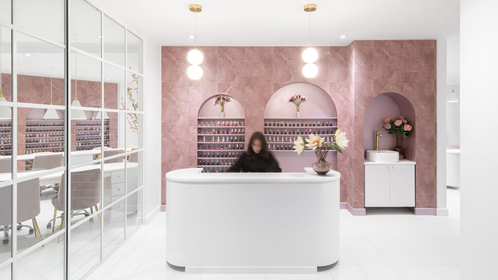 La série d’arches, clin d’œil à la forme des ongles, permet de donner une personnalité propre à l’espace, tout comme la couleur rose inspirée du lotus. C’est cette série de gestes simples et bien dosés qui permet à ce commerce de se distinguer.