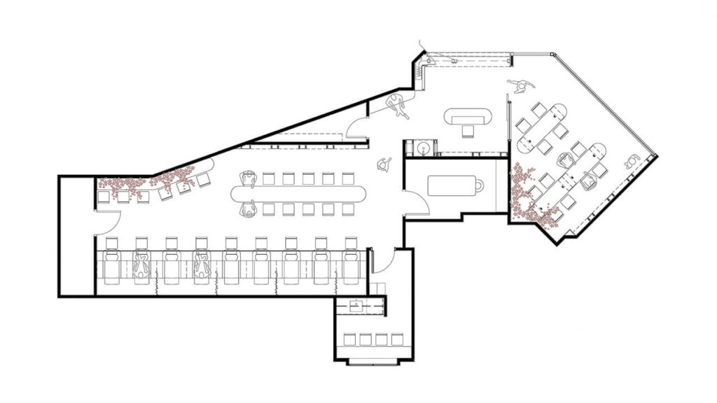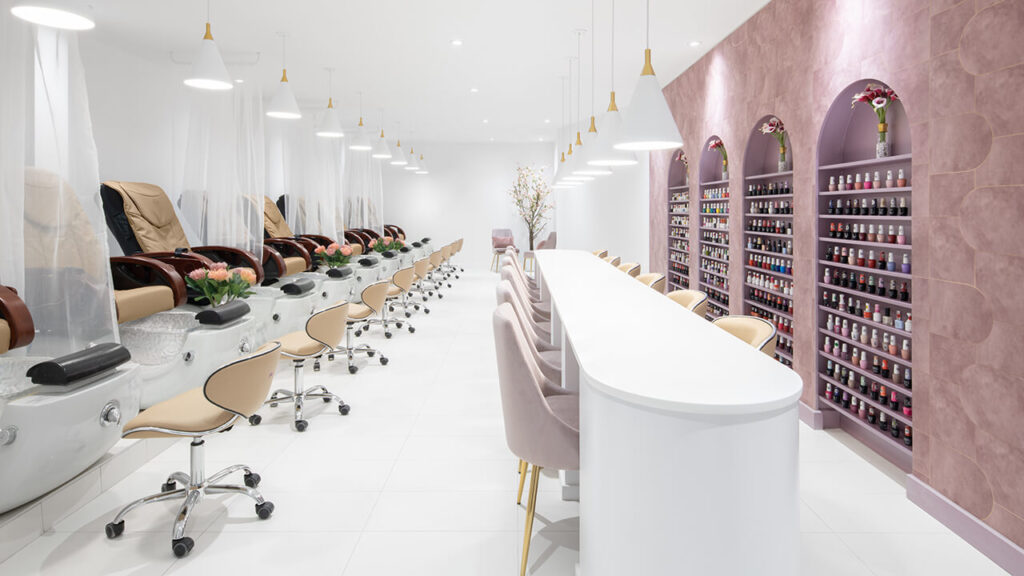 Deux secteurs d’activité sont aménagés en raison de contraintes techniques et de besoins particuliers en ventilation. On retrouve un secteur de pose d’ongles tandis que le deuxième met l’accent sur les manucures et les pédicures. L’aire d’accueil vient délimiter ces zones et répartir les services.